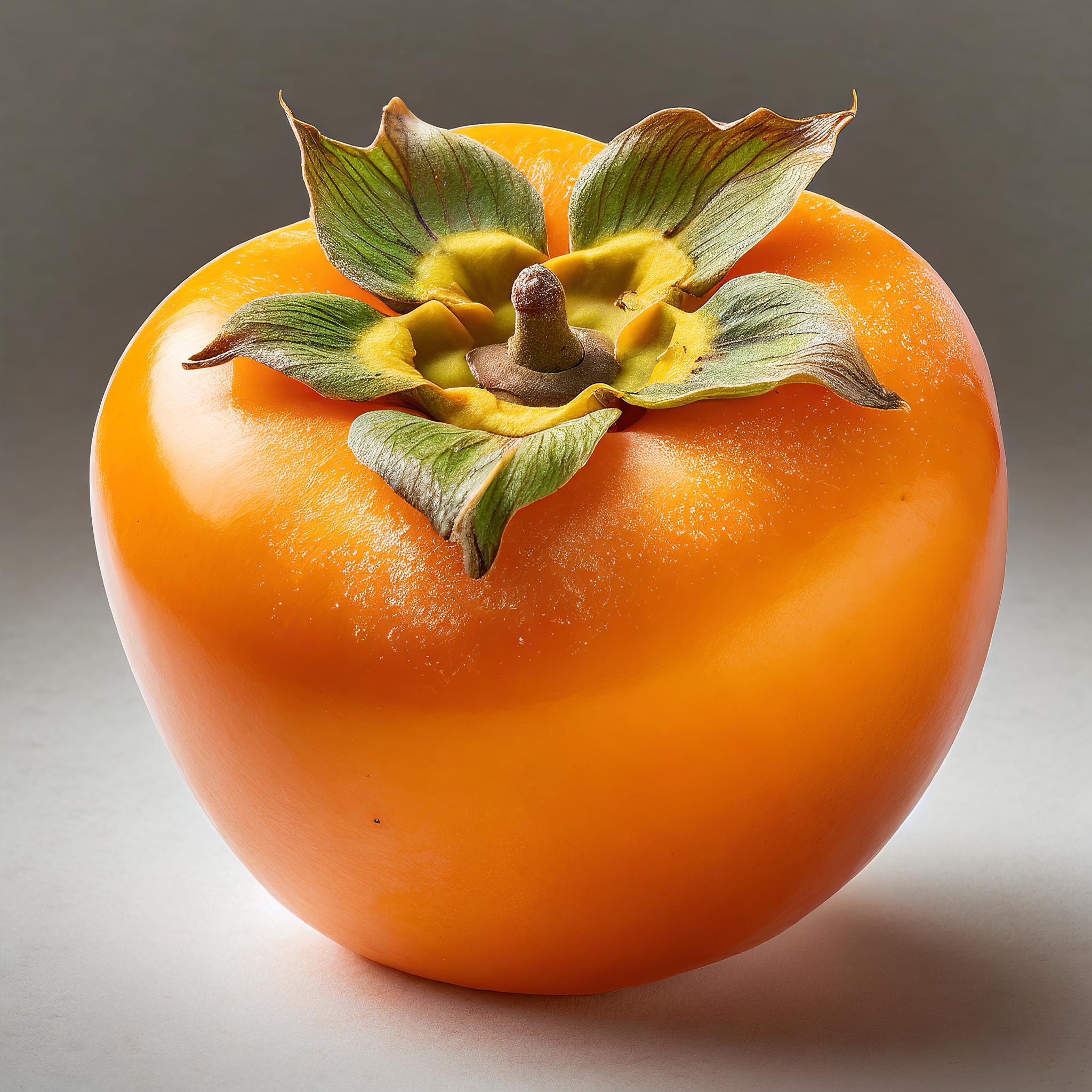 A very detailed and realistic image of a persimmon isolated on a plain white background. The fruit occupies the entire frame without exceeding it, with no overflow. A whole persimmon, not cut in half, and there is only one persimmon. The image is very precise, allowing the texture of the skin to be appreciated. The persimmon is illuminated by soft light, still highlighting its shape. The persimmon has no leaves.
