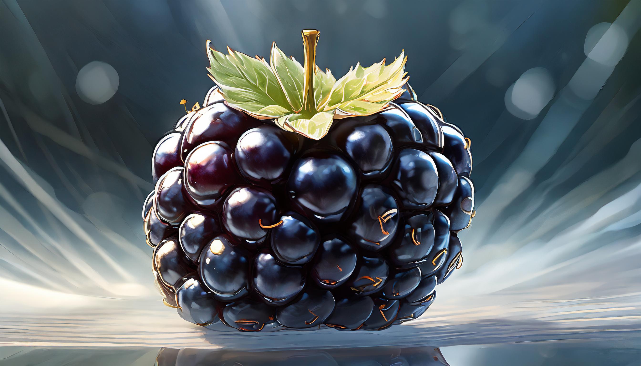 Une image très détaillée et réaliste d'une seule mûre isolée sur un fond blanc uni. Le fruit remplit entièrement le cadre sans déborder ou aller au-delà des bords. La mûre est entière, non coupée en deux, et il n'y a qu'une seule mûre dans l'image. L'image est très précise, mettant en avant la texture de la peau. La mûre est éclairée par une lumière douce, qui met tout de même en valeur sa forme. La mûre n'a pas de feuilles. L'accent est mis sur la capture des détails complexes et de la texture de la surface de la mûre.