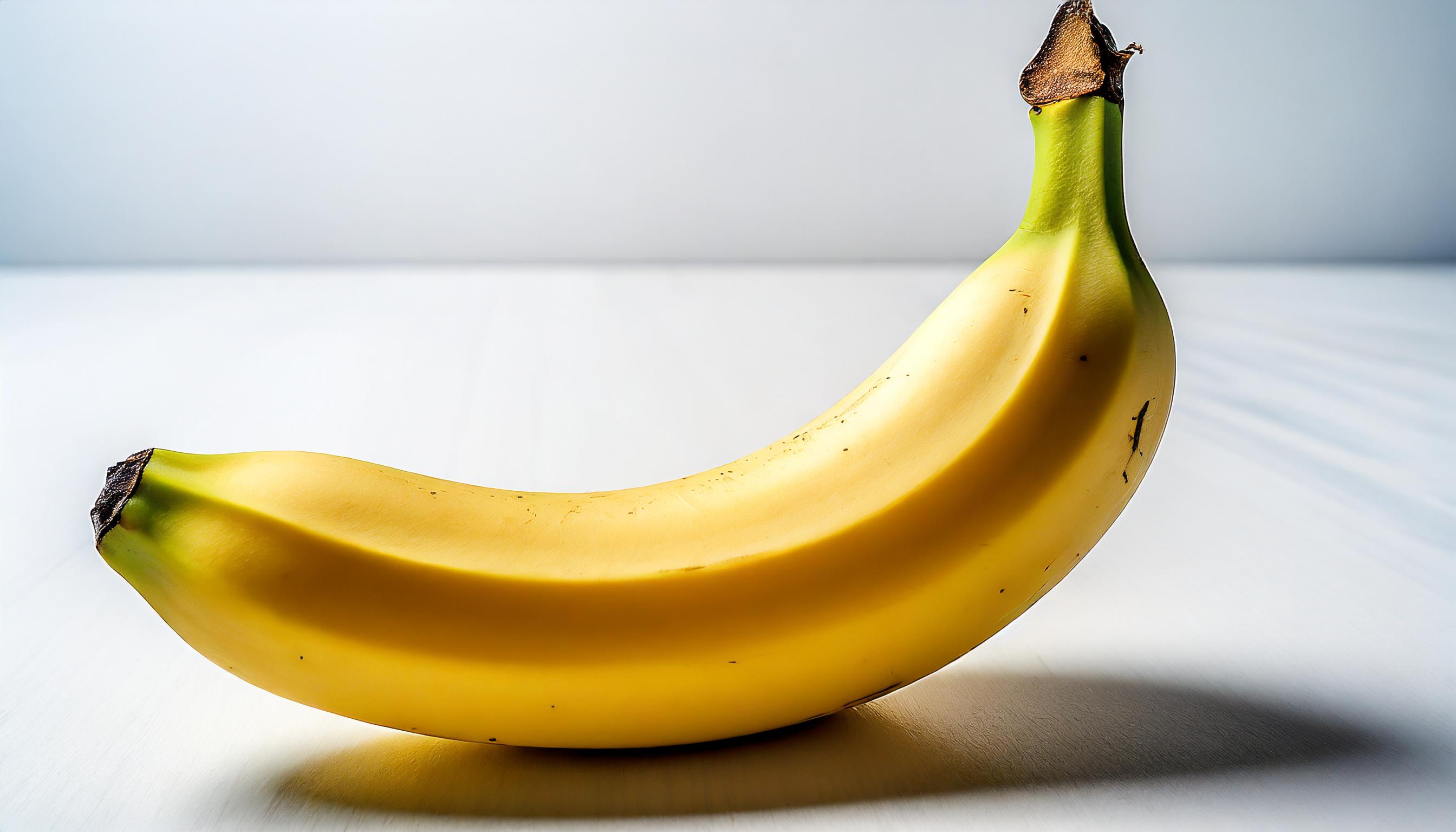 Une image très détaillée et réaliste d'une seule banane jaune isolée sur un fond blanc uni. Le fruit remplit entièrement le cadre sans déborder ni être coupé. La banane est entière, non coupée en deux, et il n'y a qu'une seule banane. L'image est très précise, mettant en évidence la texture de la peau de la banane. La banane est éclairée par une lumière douce, qui accentue néanmoins sa forme. Il n'y a pas de feuilles attachées à la banane.