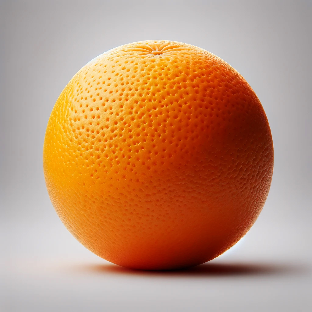 Une image très détaillée et réaliste d'un seul fruit orange entier isolé sur un fond blanc uni, remplissant entièrement le cadre sans dépasser ses limites. L'orange n'est pas coupée en deux, et il n'y a qu'une seule orange dans l'image. L'image est très précise, mettant en évidence la texture granuleuse de la peau. L'orange est éclairée par une lumière douce qui souligne néanmoins sa forme ronde, et l'orange est dépourvue de feuilles.