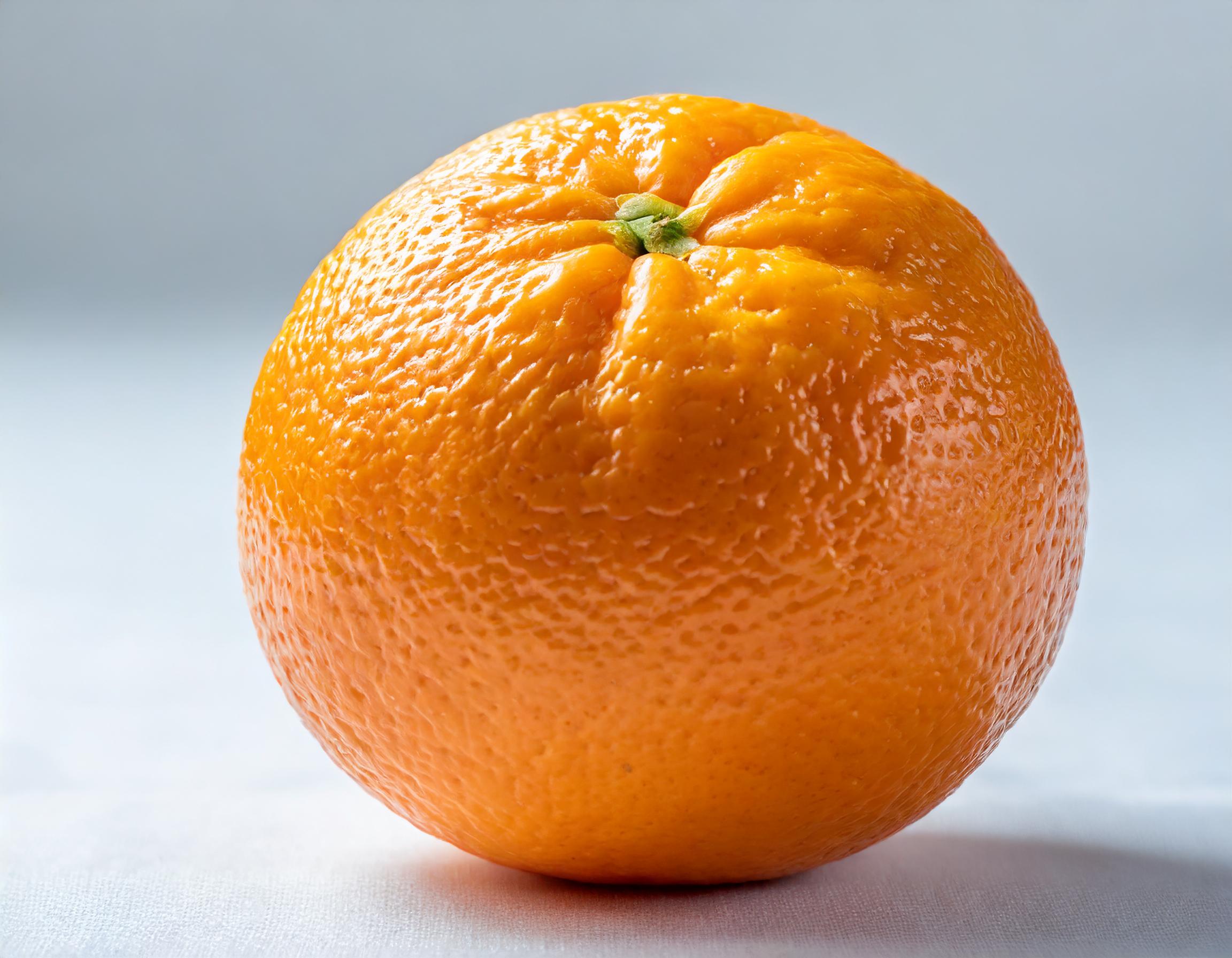Une image très détaillée et réaliste d'un seul fruit orange entier isolé sur un fond blanc uni, remplissant entièrement le cadre sans dépasser ses limites. L'orange n'est pas coupée en deux, et il n'y a qu'une seule orange dans l'image. L'image est très précise, mettant en évidence la texture granuleuse de la peau. L'orange est éclairée par une lumière douce qui souligne néanmoins sa forme ronde, et l'orange est dépourvue de feuilles.