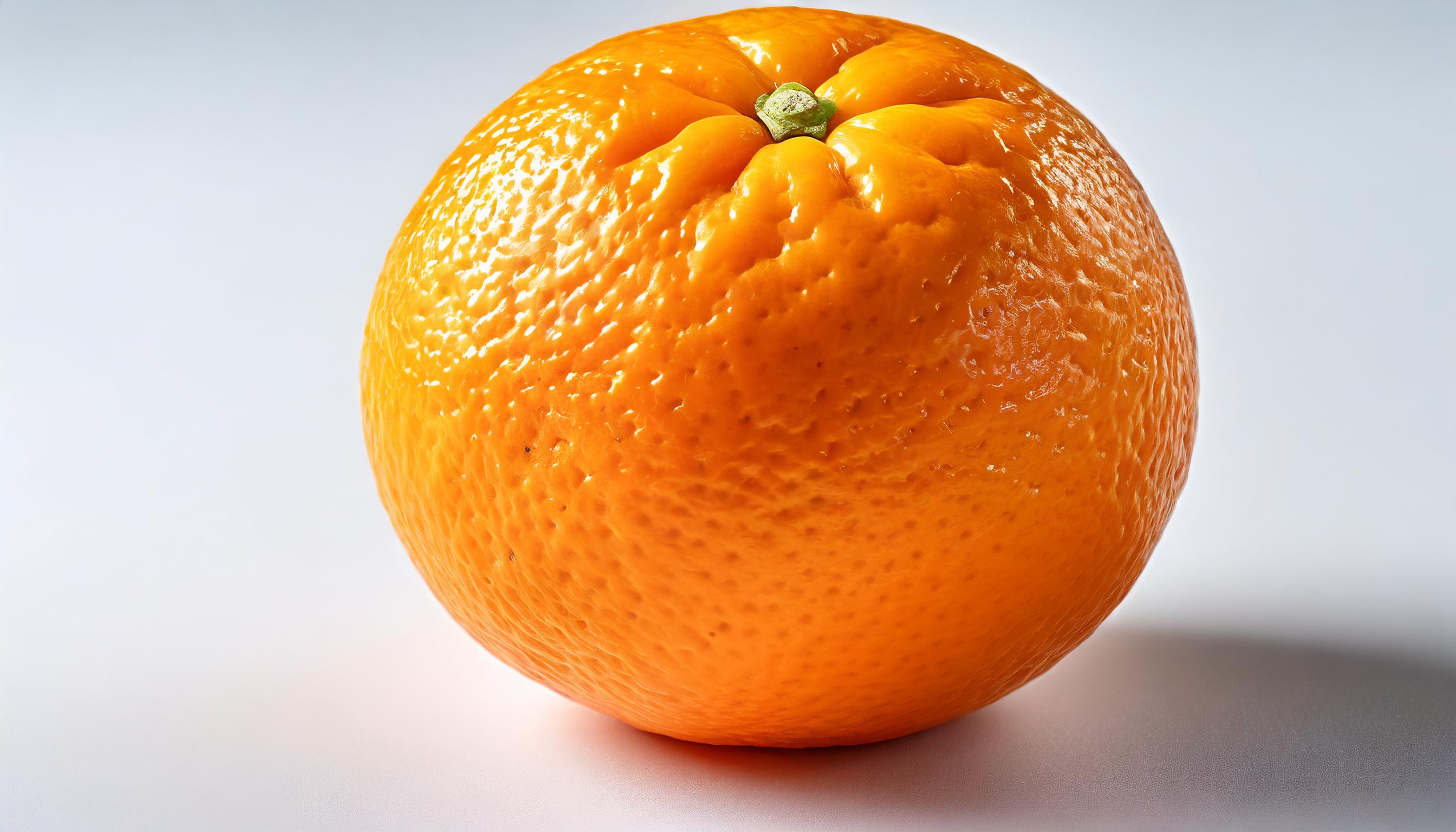 Une image très détaillée et réaliste d'un seul fruit orange entier isolé sur un fond blanc uni, remplissant entièrement le cadre sans dépasser ses limites. L'orange n'est pas coupée en deux, et il n'y a qu'une seule orange dans l'image. L'image est très précise, mettant en évidence la texture granuleuse de la peau. L'orange est éclairée par une lumière douce qui souligne néanmoins sa forme ronde, et l'orange est dépourvue de feuilles.