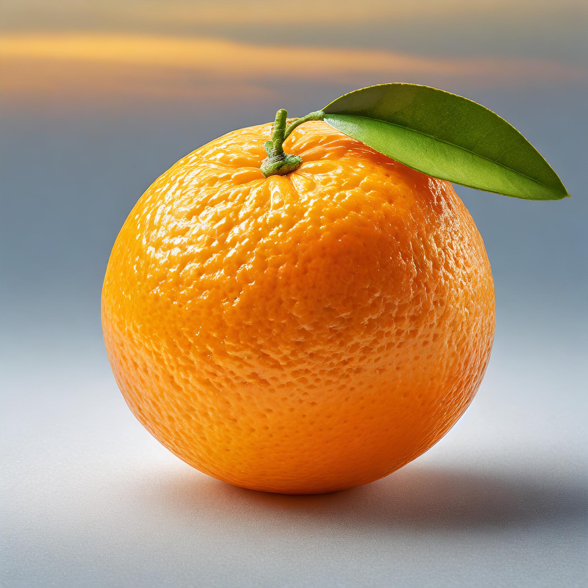 Une image très détaillée et réaliste d'un seul fruit orange entier isolé sur un fond blanc uni, remplissant entièrement le cadre sans dépasser ses limites. L'orange n'est pas coupée en deux, et il n'y a qu'une seule orange dans l'image. L'image est très précise, mettant en évidence la texture granuleuse de la peau. L'orange est éclairée par une lumière douce qui souligne néanmoins sa forme ronde, et l'orange est dépourvue de feuilles.