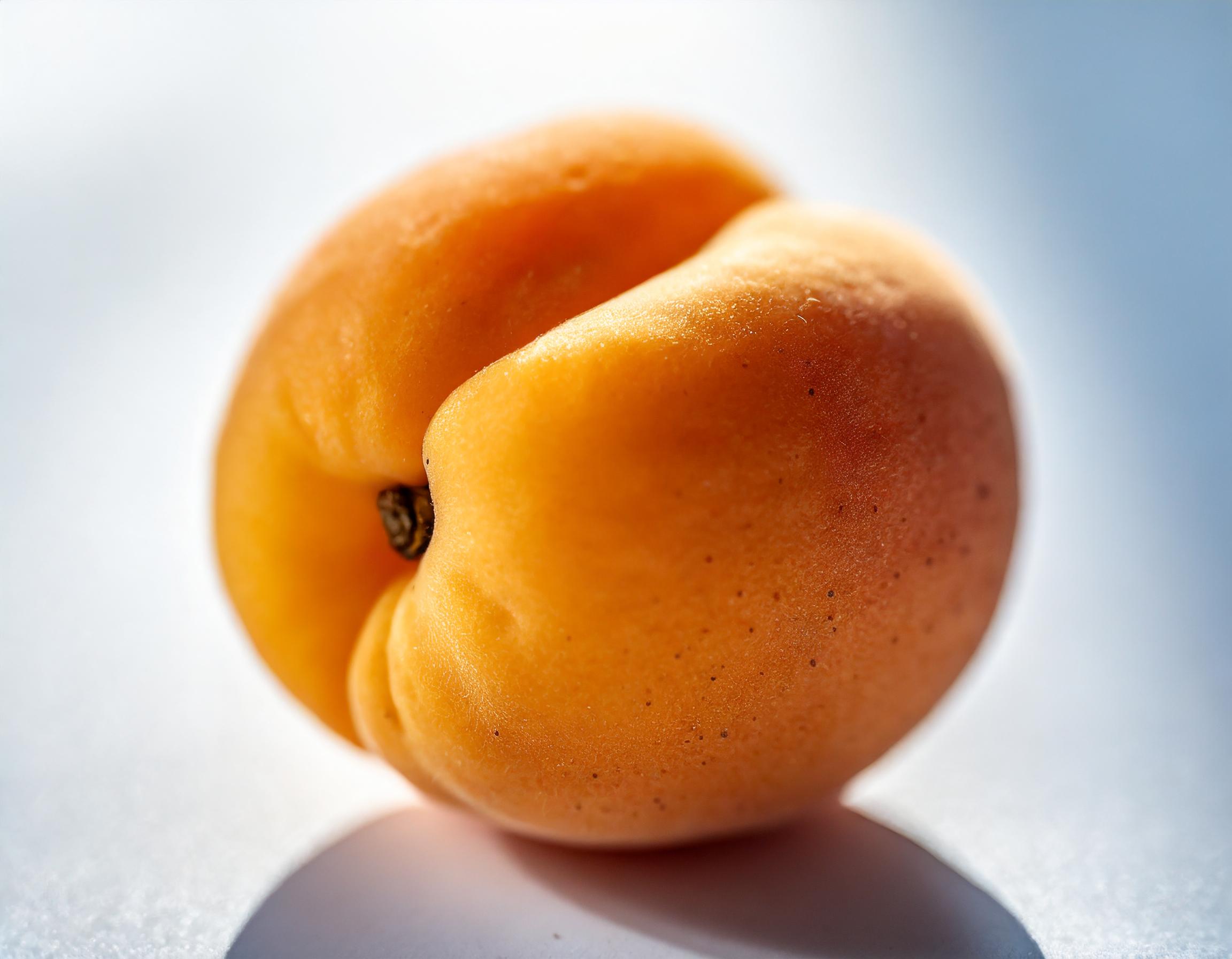 Une image très détaillée et réaliste d'un seul abricot entier isolé sur un fond blanc uni. Le fruit remplit entièrement le cadre sans dépasser ses limites. L'abricot n'est pas coupé, avec un seul abricot présent dans l'image. L'image est très précise, mettant en valeur la texture de la peau de l'abricot. L'abricot est éclairé par une lumière douce, qui souligne sa forme. L'abricot n'a pas de feuilles.