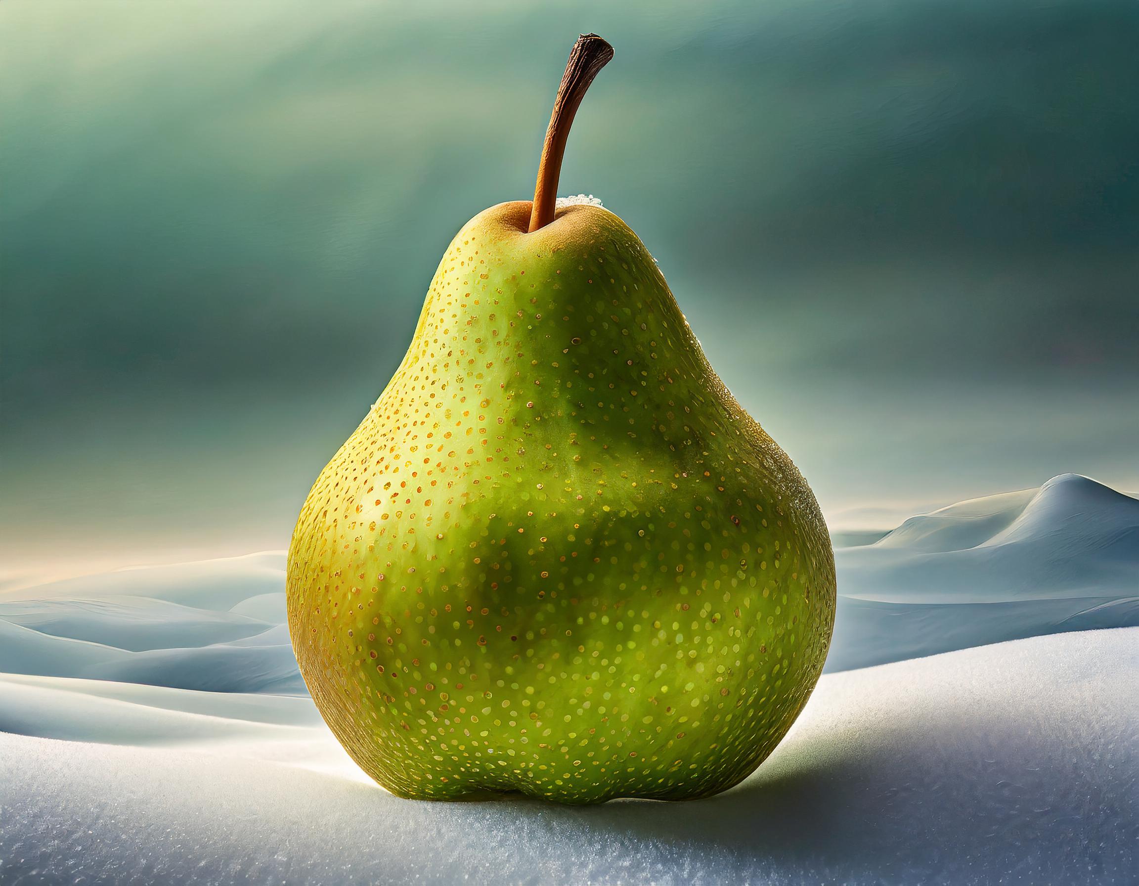 A very detailed and realistic image of a green pear isolated on a plain white background. The fruit fills the entire frame without exceeding its boundaries, intact, not cut in half, and there is only one pear. The image is highly detailed, showcasing the texture of the pear's skin. The pear is lit with soft light, highlighting its shape without leaves.