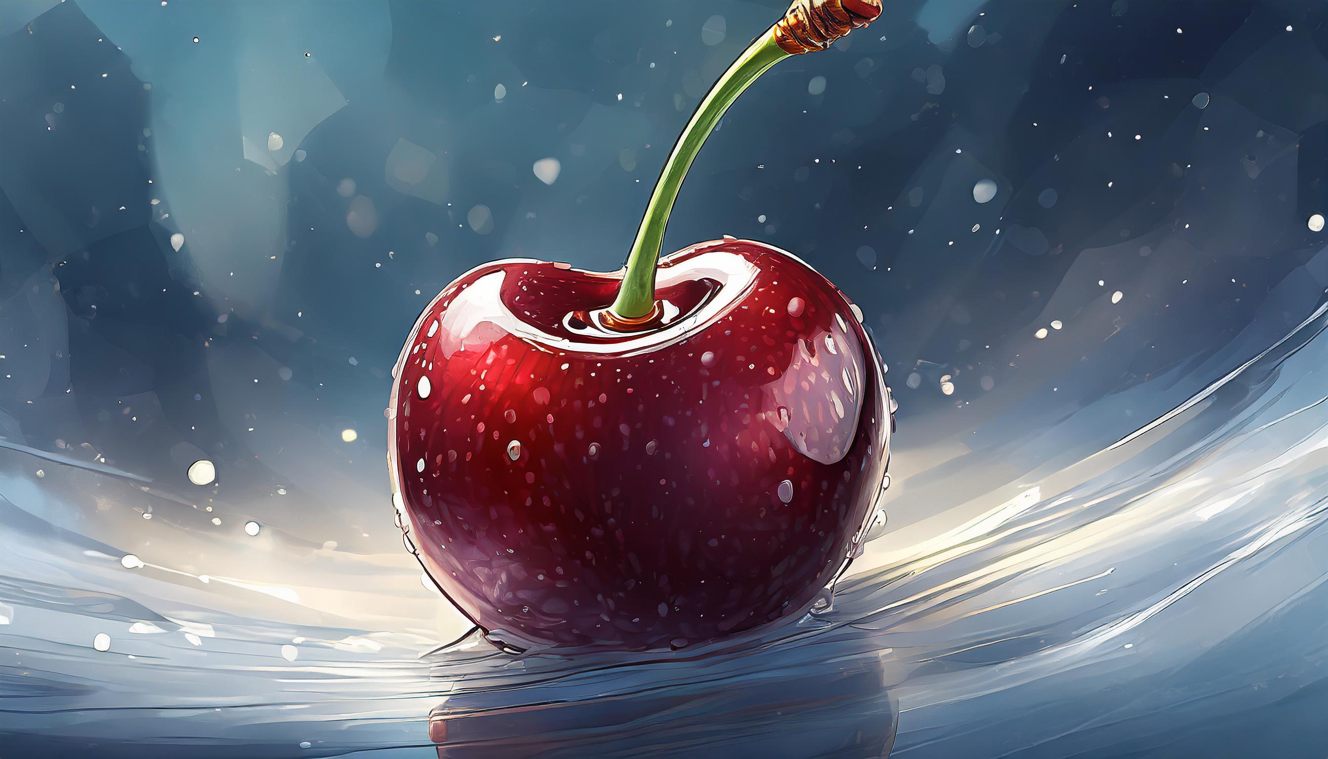 A highly detailed and realistic image of a single cherry isolated on a plain white background. The fruit fills the entire frame without exceeding it, perfectly contained within the boundaries. It's a whole cherry, not cut in half, and there's only one. The image is very precise, showcasing the texture of the cherry's skin. The cherry is illuminated by a soft light that still manages to highlight its shape. There are no leaves attached to the cherry.