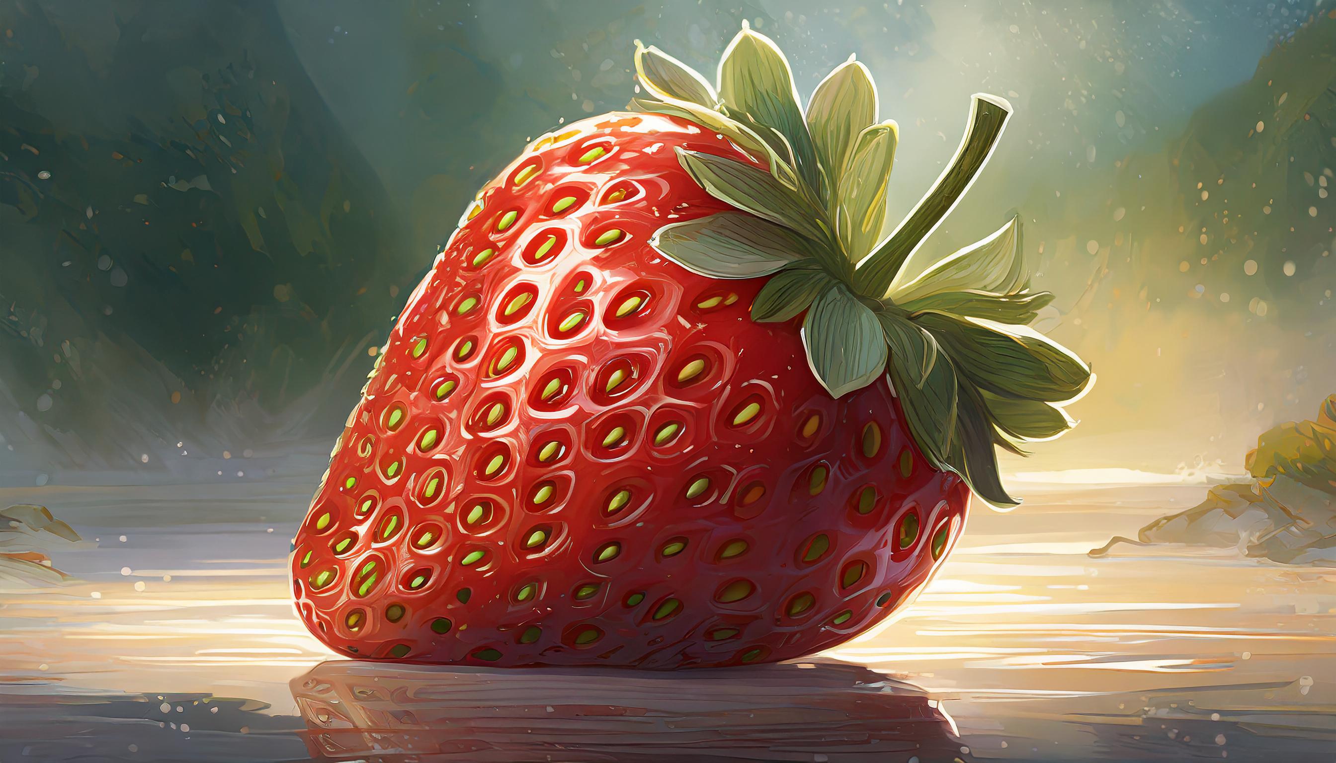 Une image très détaillée et réaliste d'une seule fraise entière isolée sur un fond blanc uni. La fraise occupe tout le cadre sans dépasser ses limites. Le fruit n'est pas coupé en deux, et il n'y a qu'une seule fraise dans l'image. L'image est très précise, mettant en valeur la texture de la peau de la fraise en détail. La fraise est éclairée par une lumière douce, soulignant sa forme sans feuilles. La composition est conçue pour mettre l'accent sur la texture et la forme de la fraise.