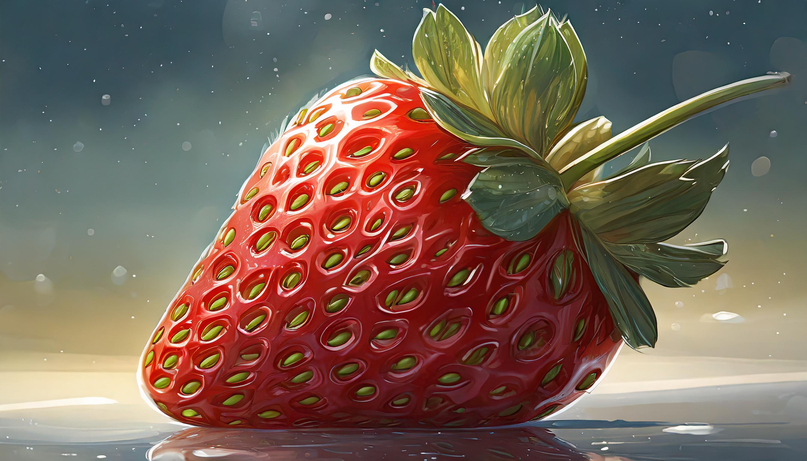 Une image très détaillée et réaliste d'une seule fraise entière isolée sur un fond blanc uni. La fraise occupe tout le cadre sans dépasser ses limites. Le fruit n'est pas coupé en deux, et il n'y a qu'une seule fraise dans l'image. L'image est très précise, mettant en valeur la texture de la peau de la fraise en détail. La fraise est éclairée par une lumière douce, soulignant sa forme sans feuilles. La composition est conçue pour mettre l'accent sur la texture et la forme de la fraise.