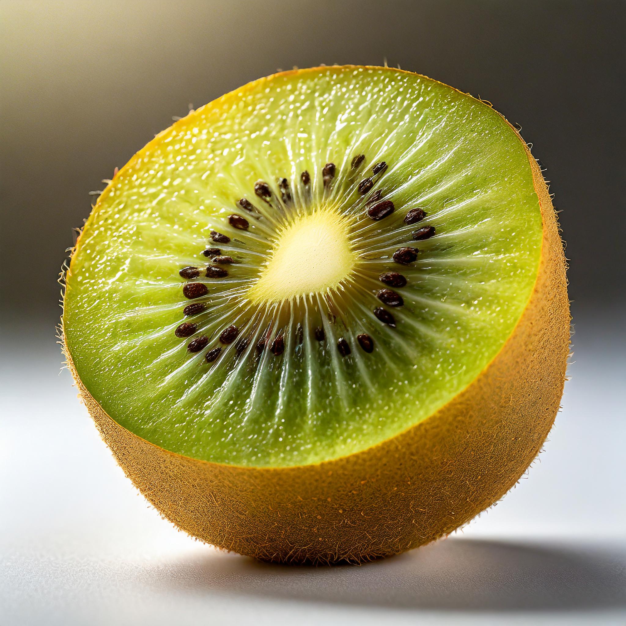 Une image très détaillée et réaliste d'un seul fruit de kiwi isolé sur un fond blanc uni. Le fruit remplit complètement le cadre sans déborder. Le kiwi est entier, non coupé en deux, et il n'y a qu'un seul kiwi dans l'image. L'image est très précise, mettant en valeur la texture de la peau. Le kiwi est éclairé par une lumière douce, qui met en évidence sa forme. Il n'y a pas de feuilles sur le kiwi.