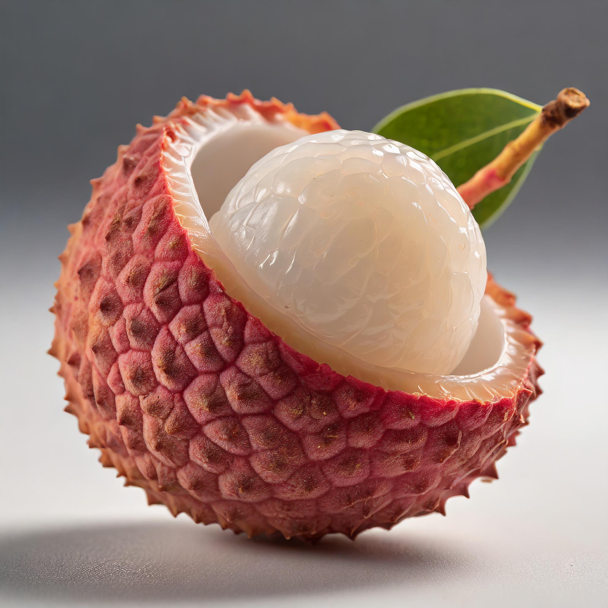 A highly detailed and realistic image of a single lychee isolated on a plain white background. The fruit fills the entire frame without overflowing. The lychee is whole, not cut in half, and there is only one lychee. The image is very precise, highlighting the texture of the skin. The lychee is illuminated by soft light, which still accentuates its shape. The lychee has no leaves.