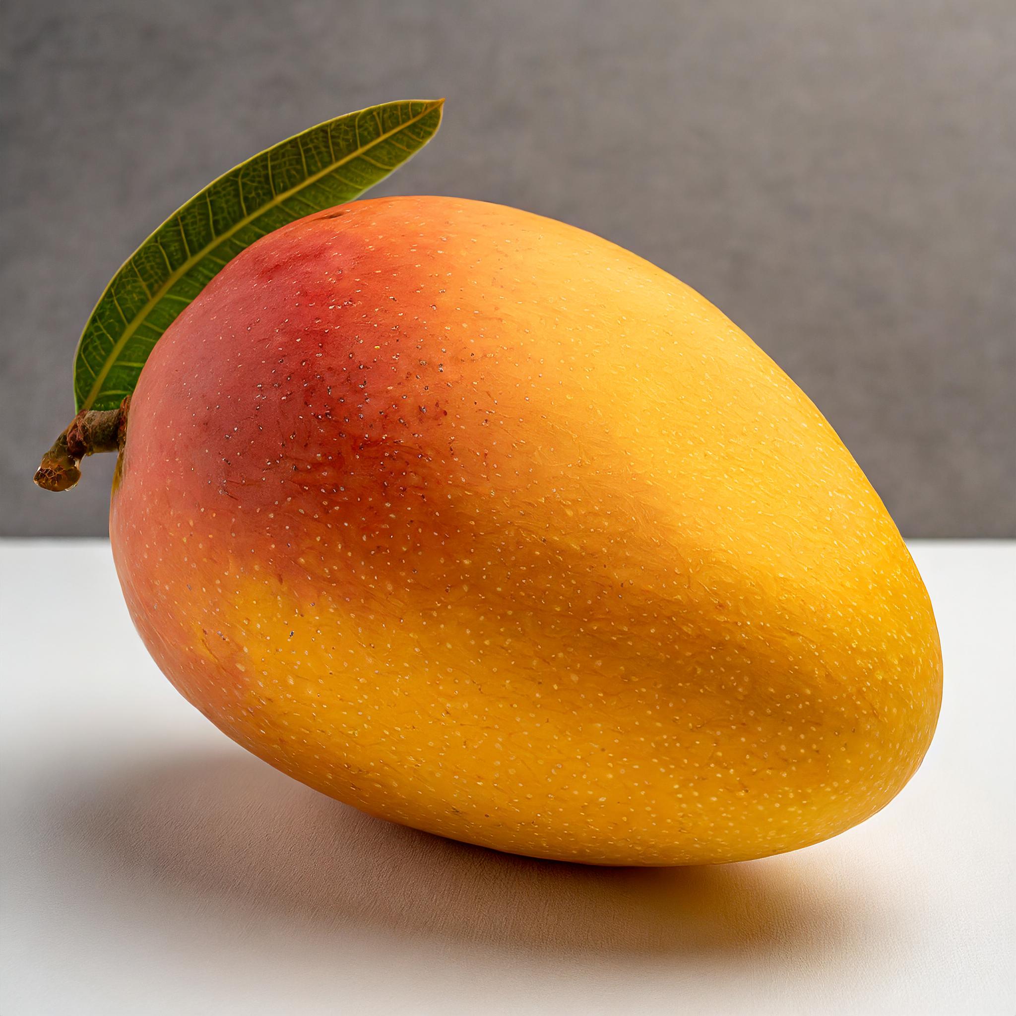 A highly detailed and realistic image of a single mango isolated on a plain white background. The fruit occupies the entire frame without exceeding its boundaries. The mango is whole, not cut in half, and there is only one mango. The image is very precise, showcasing the texture of the mango's skin. The mango is illuminated by soft light, highlighting its shape without leaves.