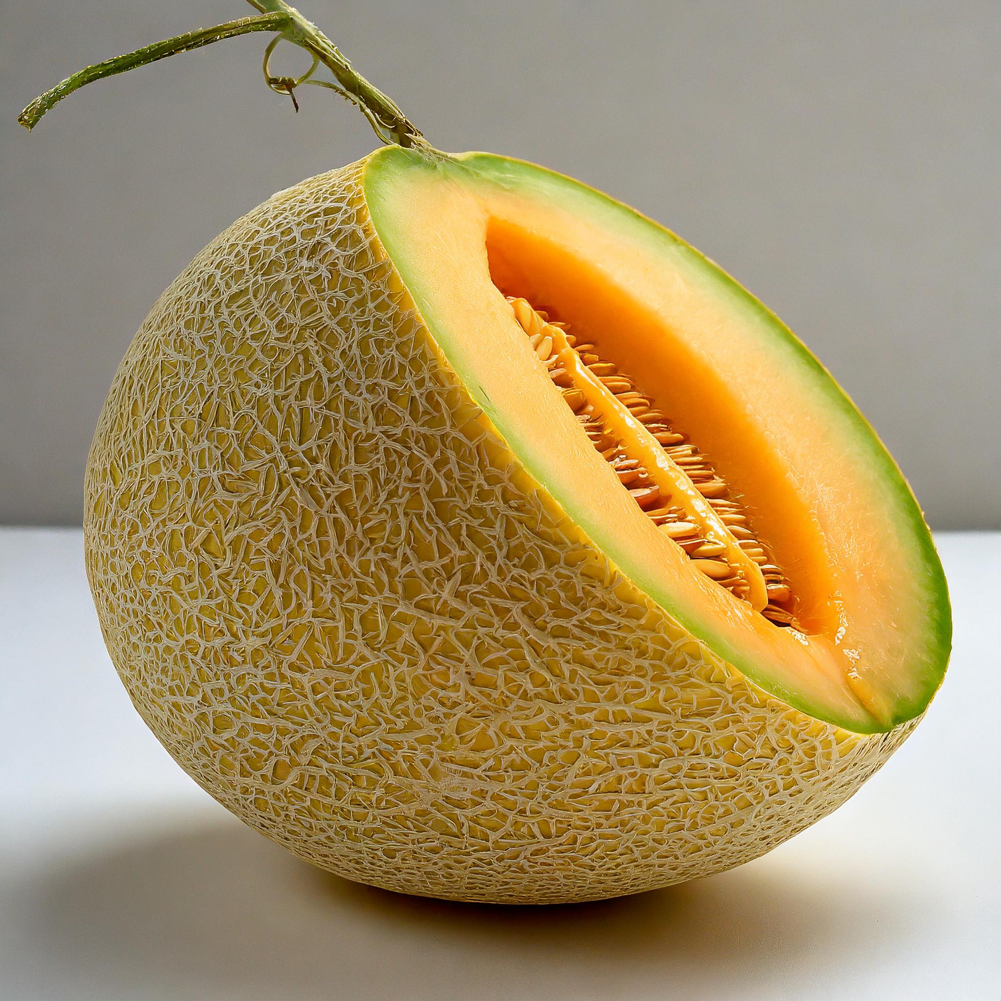 A highly detailed and realistic image of a single whole melon, isolated on a plain white background. The fruit occupies the entire frame without overflowing. The melon is not cut in half, and there is only one melon. The image is very precise, showcasing the texture of the skin. The melon is illuminated by a soft light, which still highlights its shape. The melon is devoid of leaves.