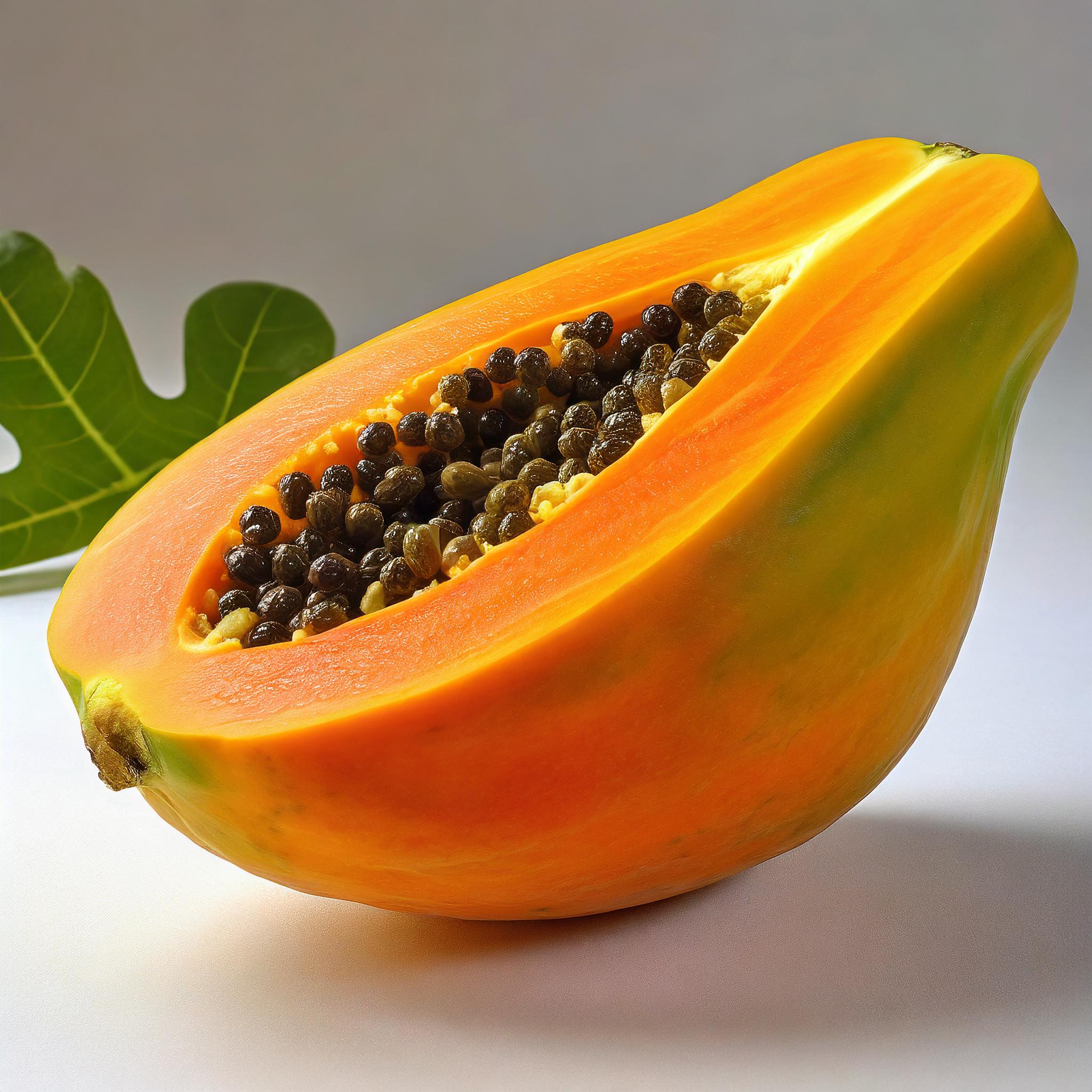 Une image très détaillée et réaliste d'une seule papaye entière isolée sur un fond blanc uni. Le fruit occupe l'ensemble du cadre sans déborder ou excéder les limites. La papaye est entière, non coupée, présentant sa texture de peau de manière vivante sous un éclairage doux qui met en valeur sa forme. Il n'y a pas de feuilles attachées à la papaye.