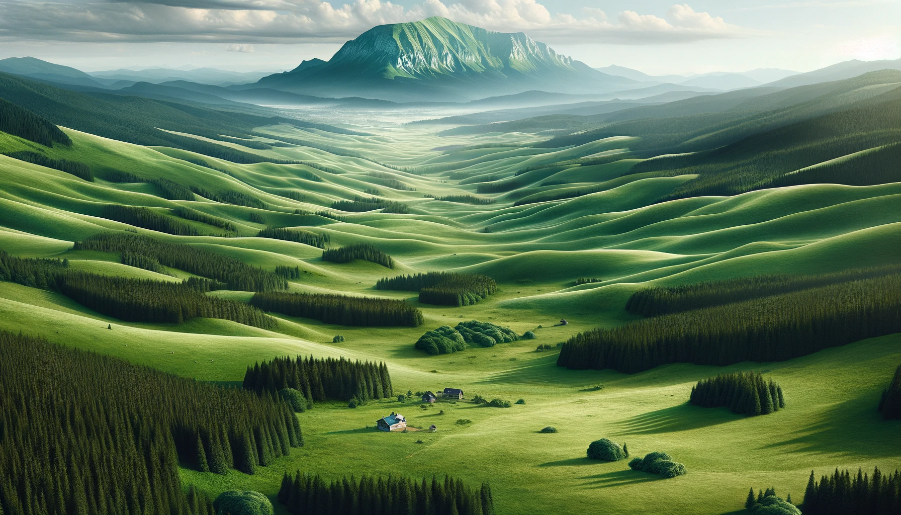 Une image très réaliste d'une plaine herbeuse verte ondulante et sans fin, s'étendant aussi loin que le regard peut porter. À l'arrière-plan lointain, il y a une montagne majestueuse partiellement cachée derrière une forêt dense. Quelques maisons de montagne éparses sont nichées autour de la forêt, se fondant harmonieusement dans le paysage naturel.