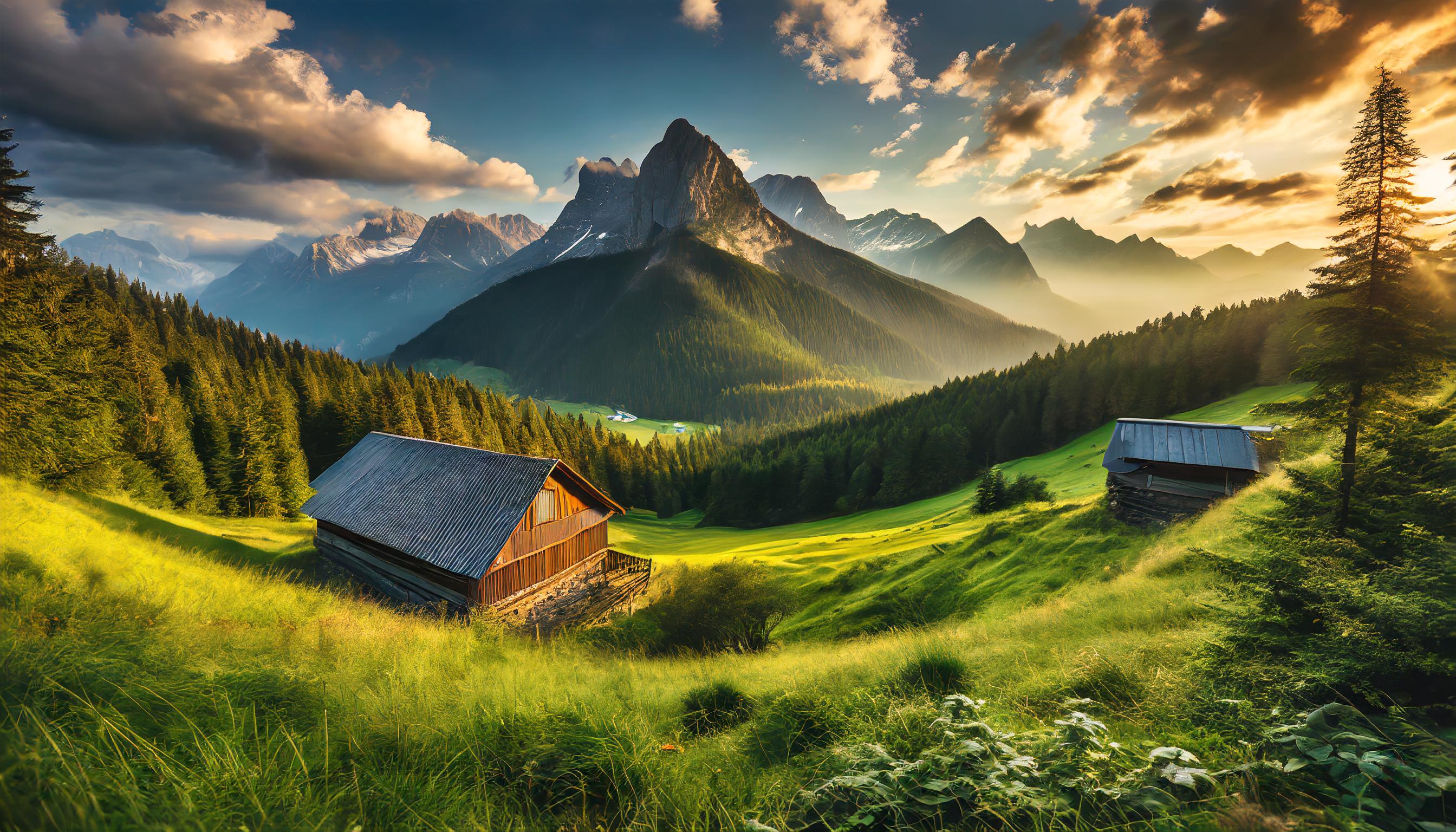 realistic photo-quality image of a vast, rolling green grassy plain. In the background, there is a distant mountain behind a dense forest. Scattered around the mountain are a few mountain homes.