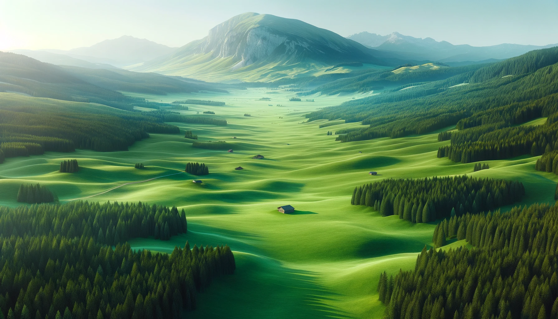 Une image très réaliste d'une plaine herbeuse verte ondulante et sans fin, s'étendant aussi loin que le regard peut porter. À l'arrière-plan lointain, il y a une montagne majestueuse partiellement cachée derrière une forêt dense. Quelques maisons de montagne éparses sont nichées autour de la forêt, se fondant harmonieusement dans le paysage naturel.