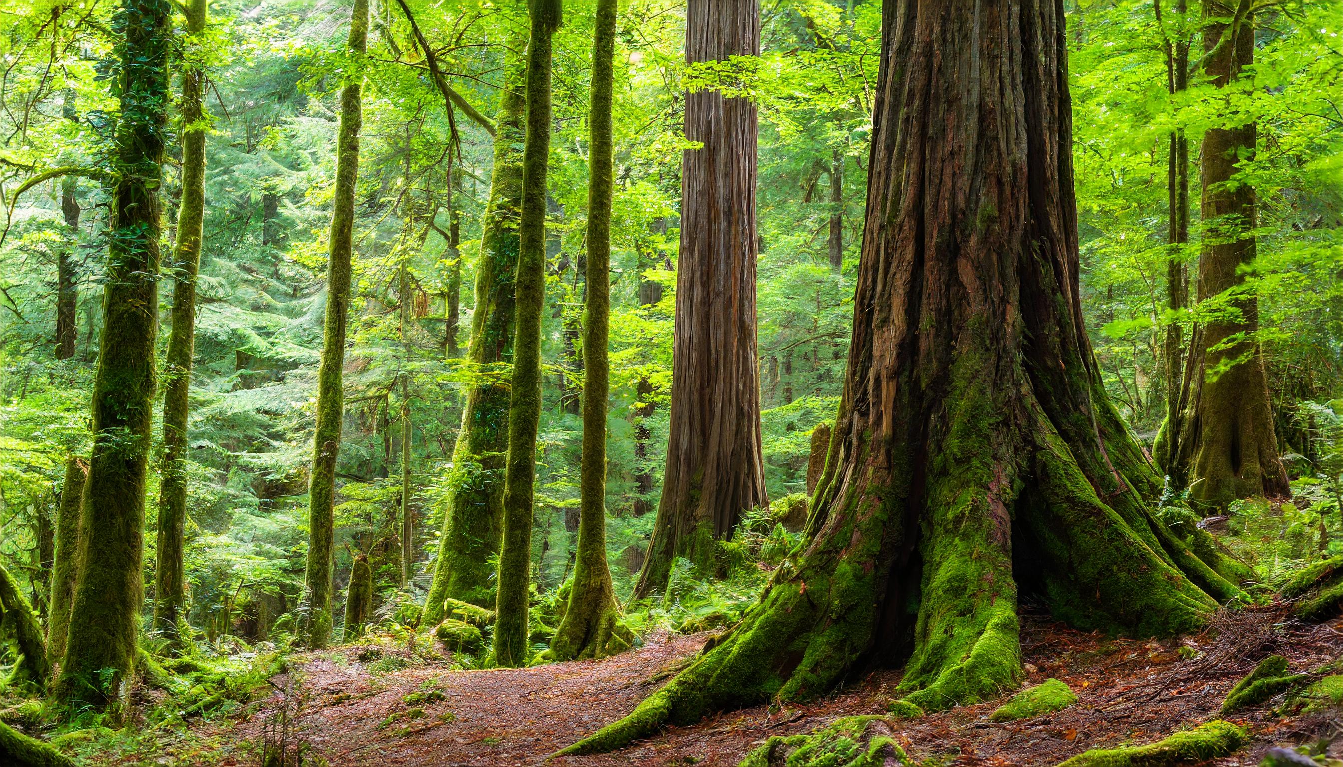 A highly realistic image of the interior of an ancient forest, filled with centenarian trees. These majestic trees have thick, gnarled trunks and a dense canopy of leaves, casting a pattern of light and shadow on the forest floor. The ground is covered with a lush layer of moss, ferns, and fallen leaves, adding to the serene and timeless atmosphere of this old-growth forest.