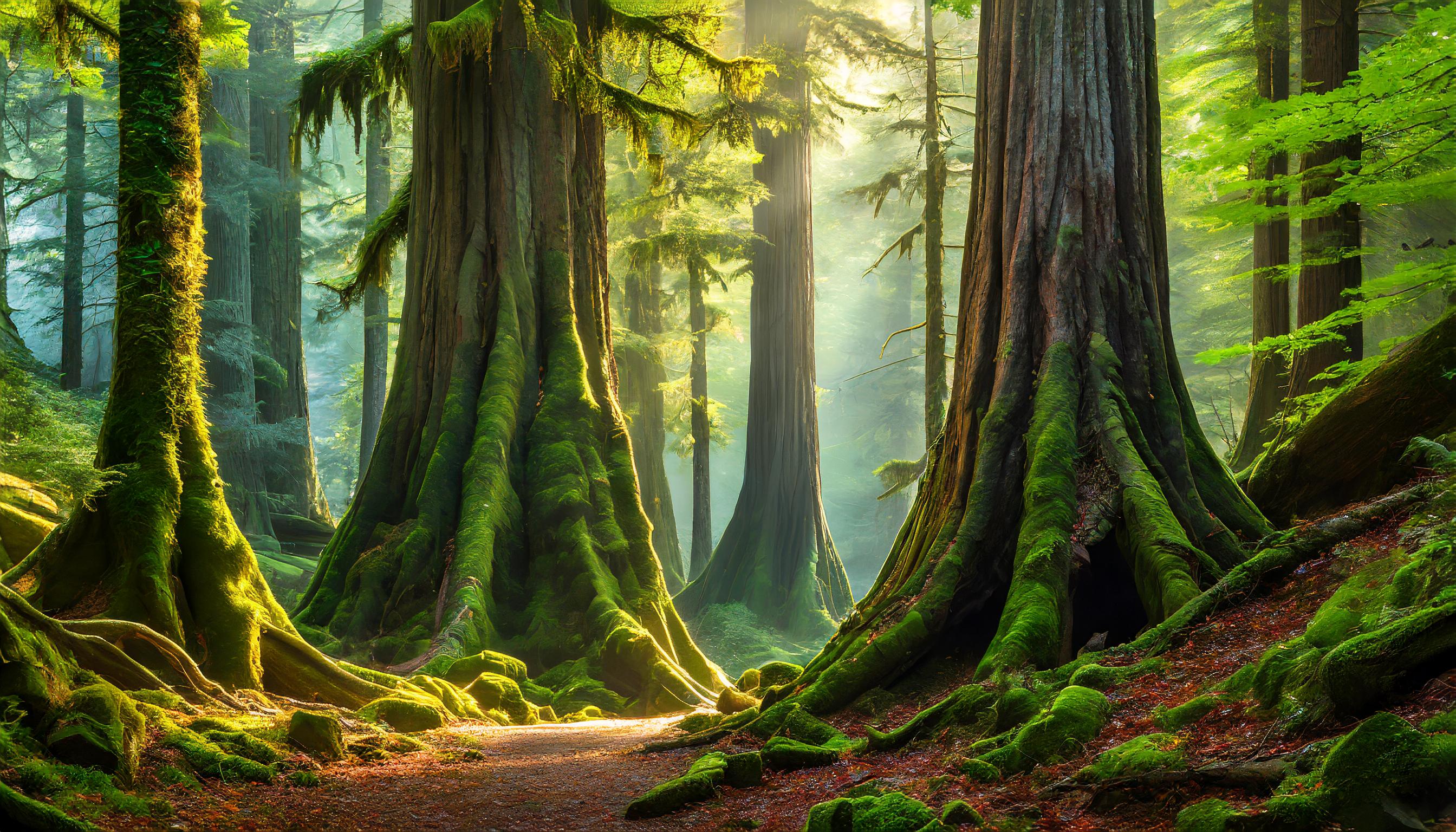 A highly realistic image of the interior of an ancient forest, filled with centenarian trees. These majestic trees have thick, gnarled trunks and a dense canopy of leaves, casting a pattern of light and shadow on the forest floor. The ground is covered with a lush layer of moss, ferns, and fallen leaves, adding to the serene and timeless atmosphere of this old-growth forest.