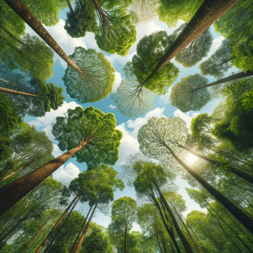 Une vue en contre-plongée de cinq arbres avec un feuillage dense couvrant une grande partie de l'image, donnant l'impression que quelqu'un regarde vers le haut. Le ciel, partiellement nuageux avec une couleur bleu clair, est visible à travers les feuilles. Cette scène ressemble à une belle journée de fin de printemps.