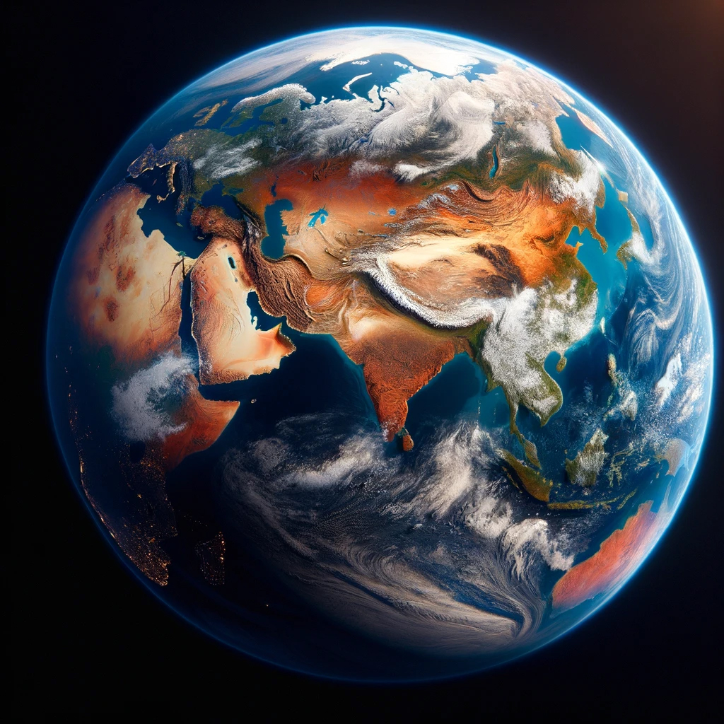 Une vue de l'espace, représentant la Terre comme une sphère où les continents et les océans sont clairement visibles. Les continents sont montrés avec des couleurs réalistes, représentant divers terrains tels que des déserts, des forêts et des montagnes, tandis que les océans sont dépeints dans différentes nuances de bleu pour indiquer la profondeur. Des formations de nuages peuvent être vues éparpillées à travers la planète, ajoutant au réalisme de la scène. Cette image capture la beauté et la diversité de la Terre depuis une perspective spatiale.