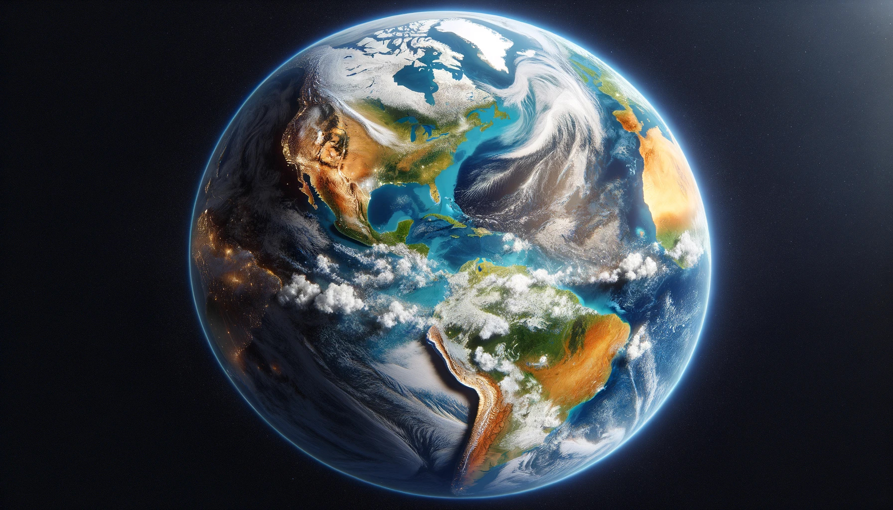 Une vue de l'espace, représentant la Terre comme une sphère où les continents et les océans sont clairement visibles. Les continents sont montrés avec des couleurs réalistes, représentant divers terrains tels que des déserts, des forêts et des montagnes, tandis que les océans sont dépeints dans différentes nuances de bleu pour indiquer la profondeur. Des formations de nuages peuvent être vues éparpillées à travers la planète, ajoutant au réalisme de la scène. Cette image capture la beauté et la diversité de la Terre depuis une perspective spatiale.