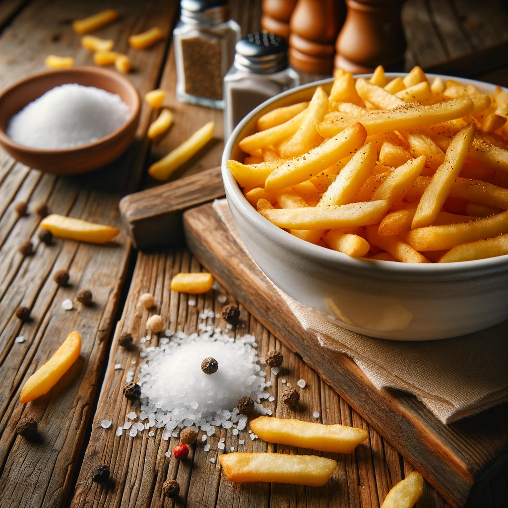 Une vue rapprochée d'une vieille table en bois présentant un bol blanc rempli de frites, soigneusement disposées pour ne pas déborder. Autour du bol, sur la table, sont éparpillés des grains de gros sel et une poivrière. La scène capture le charme rustique du cadre, mettant en lumière les textures de la table en bois et des frites croustillantes, avec le sel et le poivre ajoutant une touche culinaire.