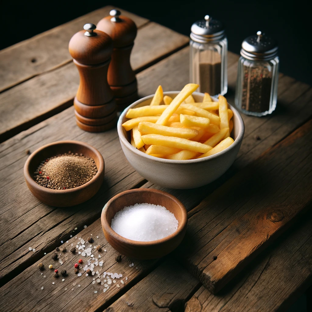 A close-up view showcases an old wooden table with a white bowl filled with fries, carefully placed to not overflow. The only other items visible on the table are grains of coarse salt and a pepper shaker, emphasizing a minimalist setting. There is nothing else on the table, focusing all attention on the bowl of fries, the salt, and the pepper. This composition highlights the simplicity and rustic elegance of the scene, with the wooden table's texture adding depth and character.