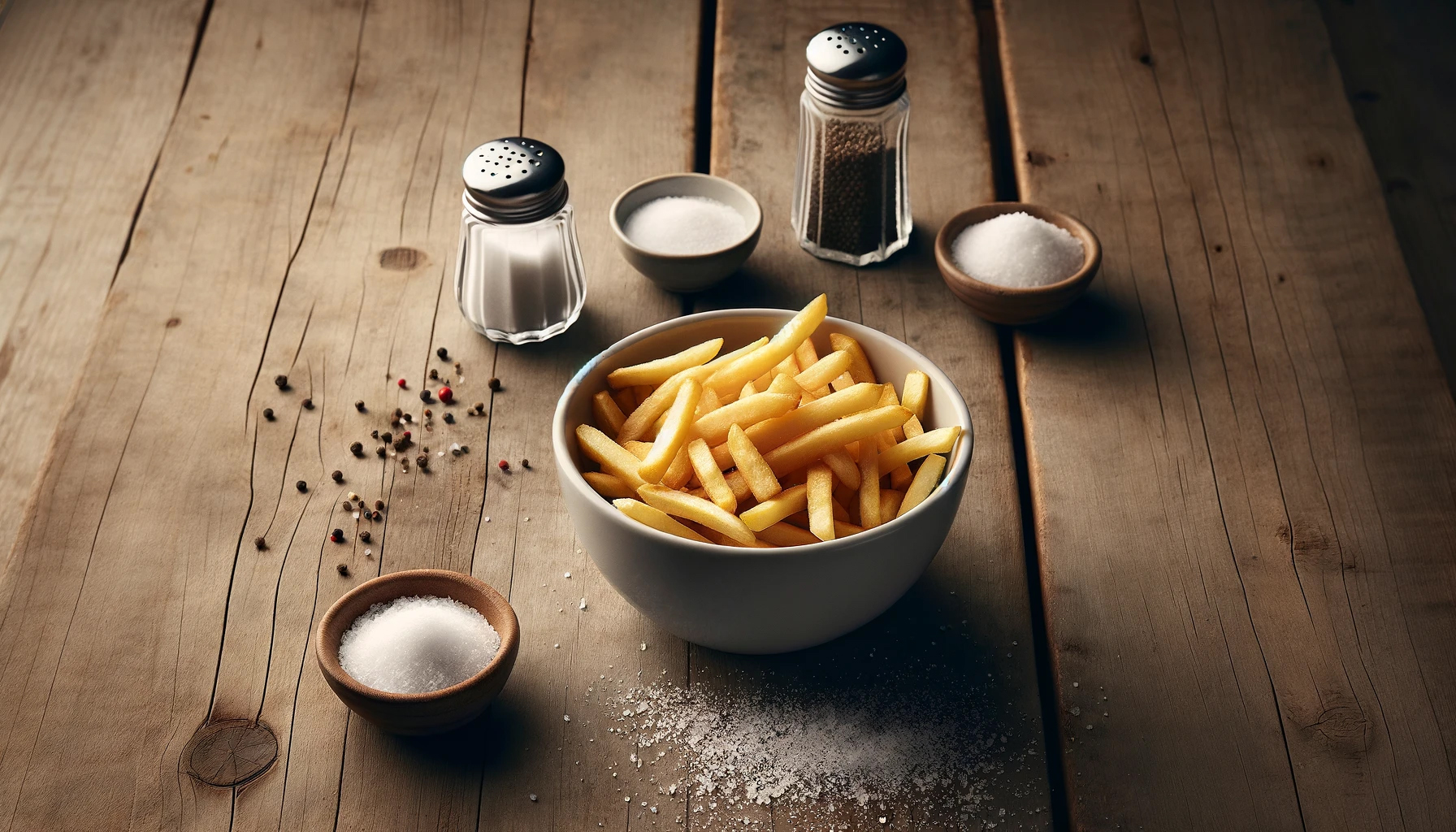 A close-up view showcases an old wooden table with a white bowl filled with fries, carefully placed to not overflow. The only other items visible on the table are grains of coarse salt and a pepper shaker, emphasizing a minimalist setting. There is nothing else on the table, focusing all attention on the bowl of fries, the salt, and the pepper. This composition highlights the simplicity and rustic elegance of the scene, with the wooden table's texture adding depth and character.