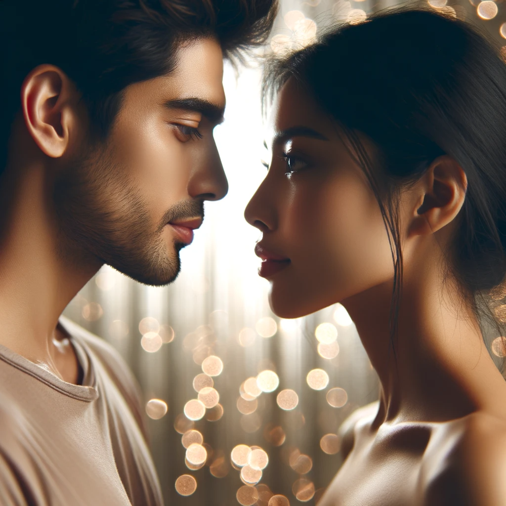 Couple vu de profil, avec un angle légèrement en faveur de l'homme, se faisant face en se regardant les lèvres. L'arrière-plan est flou et scintillant. Le cadrage inclut leurs têtes et épaules. L'homme est d'origine hispanique et la femme d'origine sud-asiatique. L'éclairage est doux et romantique, renforçant l'atmosphère intime de la scène.