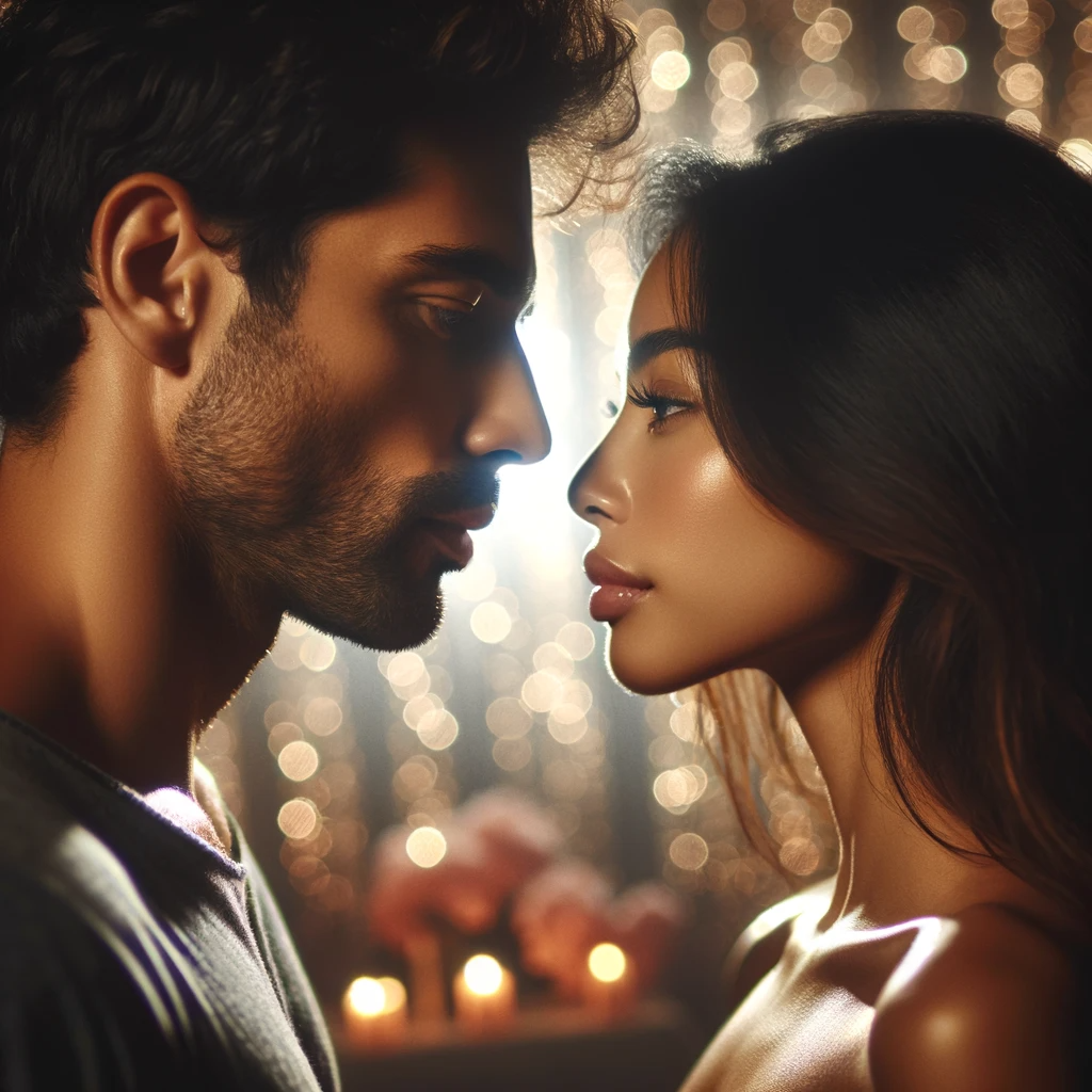 Couple vu de profil, avec un angle légèrement en faveur de l'homme, se faisant face en se regardant les lèvres. L'arrière-plan est flou et scintillant. Le cadrage inclut leurs têtes et épaules. L'homme est d'origine hispanique et la femme d'origine sud-asiatique. L'éclairage est doux et romantique, renforçant l'atmosphère intime de la scène.