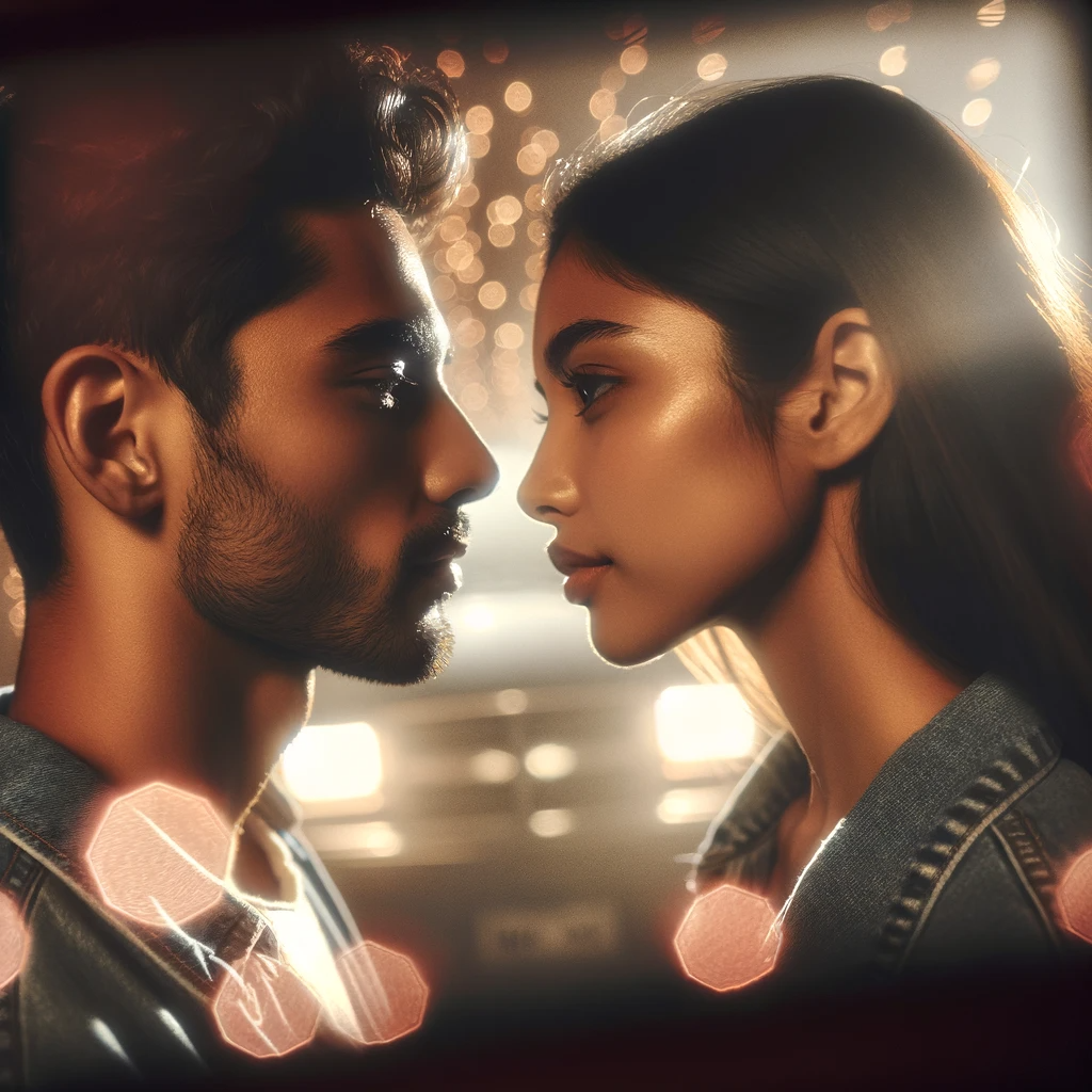 Couple vu de profil, avec un angle légèrement en faveur de l'homme, se faisant face en se regardant les lèvres. L'arrière-plan est flou et scintillant. Le cadrage inclut leurs têtes et épaules. L'homme est d'origine hispanique et la femme d'origine sud-asiatique. L'éclairage est doux et romantique, renforçant l'atmosphère intime de la scène.