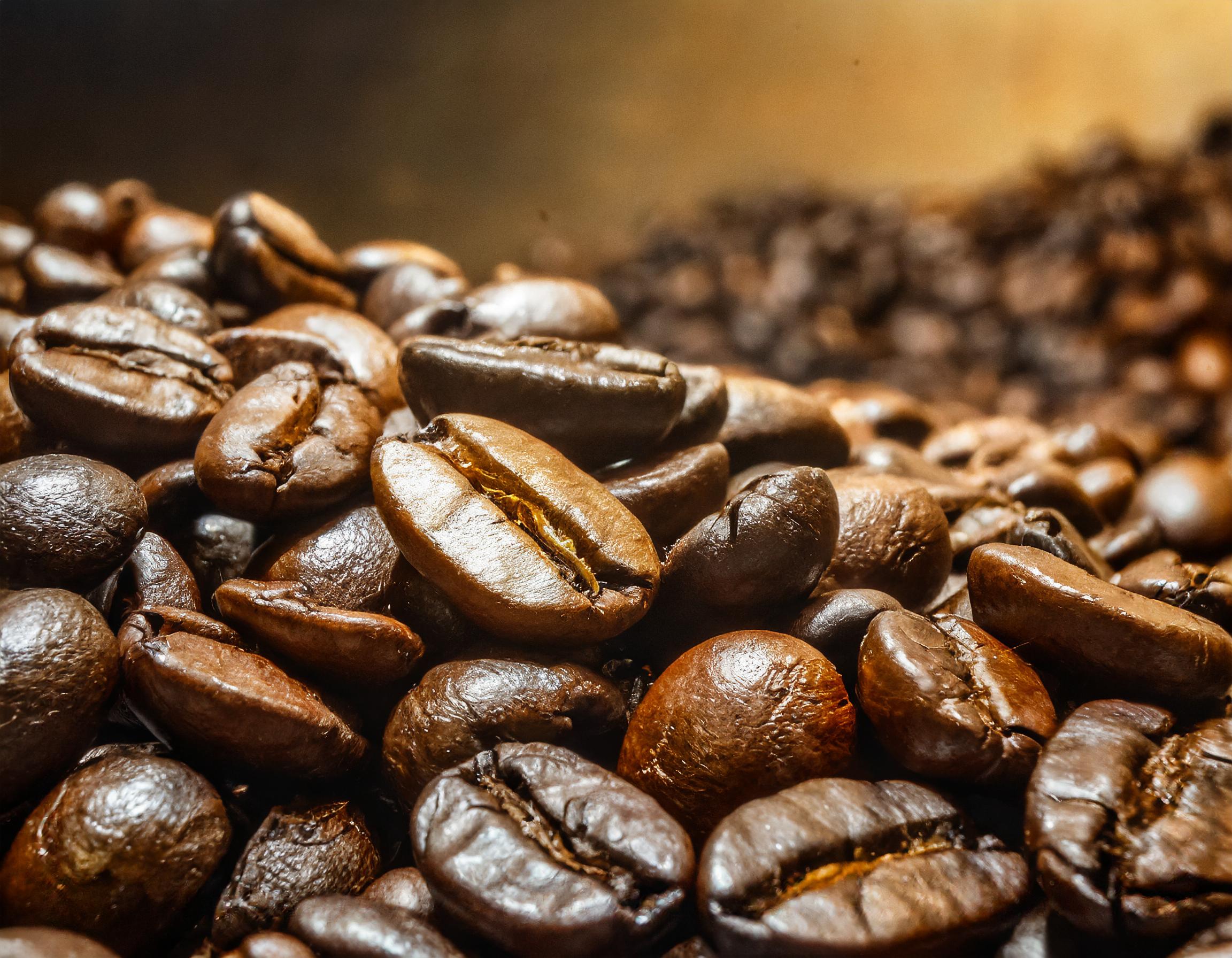 Un gros plan de grains de café empilés les uns sur les autres, avec des grains de café couvrant entièrement le cadre. L'accent est mis sur la texture et la variété des grains, mettant en avant leurs couleurs marron riches et le brillant luisant de certains grains. Cette image devrait capturer l'essence de grains de café fraîchement torréfiés, soulignant les détails tels que les légères variations de taille et de couleur parmi les grains. L'éclairage devrait mettre en valeur les contours et les ombres des grains, ajoutant de la profondeur et de la dimension à la composition.