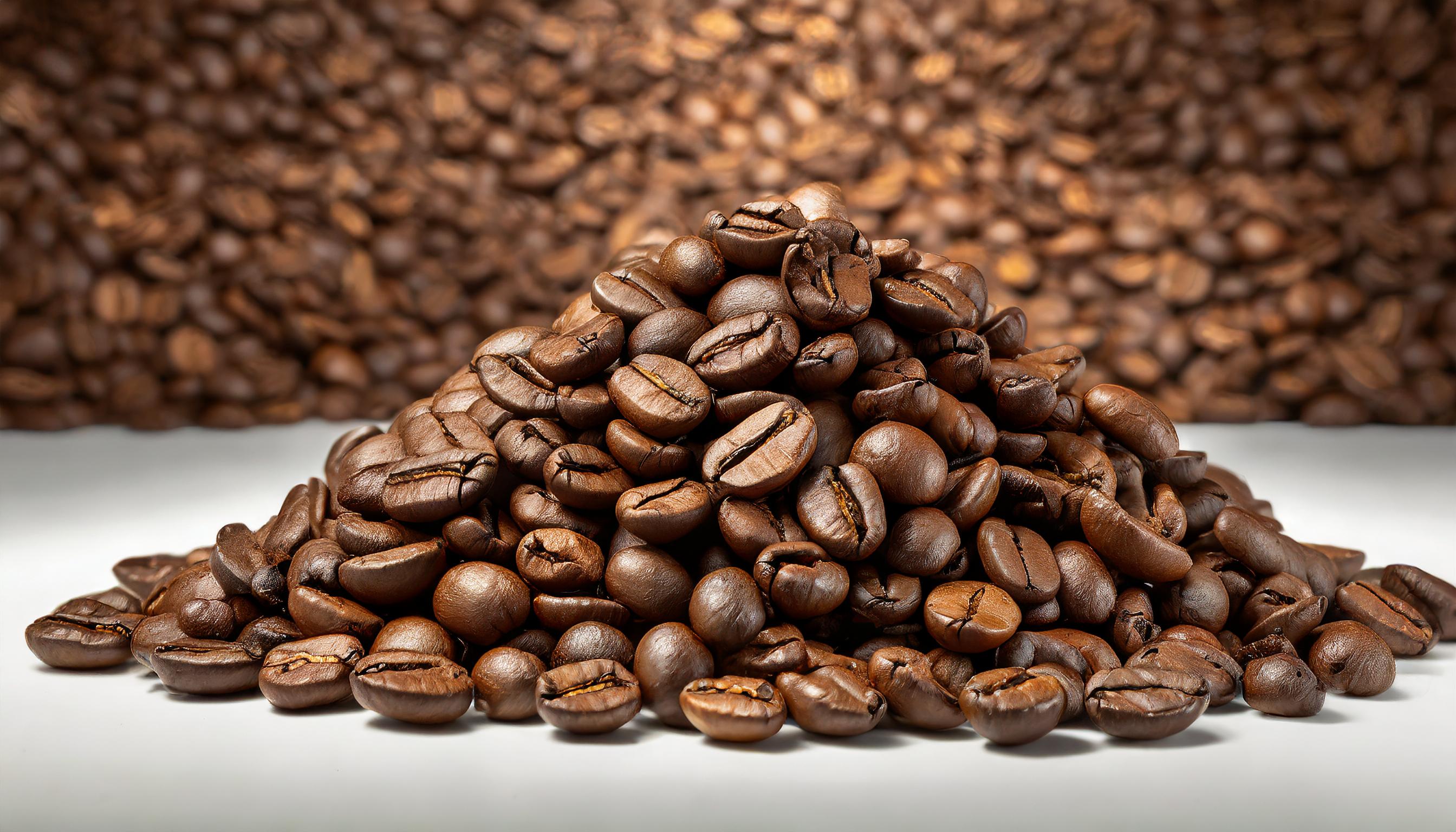 Un tas de grains de café empilés les uns sur les autres au milieu du cadre, avec un fond complètement blanc, uniforme sans aucun ombrage. L'accent est mis sur la texture et le détail des grains de café, mettant en évidence leurs couleurs marron riches et la manière dont ils s'imbriquent et s'empilent. La composition est simple et minimaliste, soulignant la beauté naturelle des grains de café contre le fond blanc éclatant. L'éclairage est doux, projetant des ombres légères et améliorant les contours de chaque grain pour un contraste frappant.