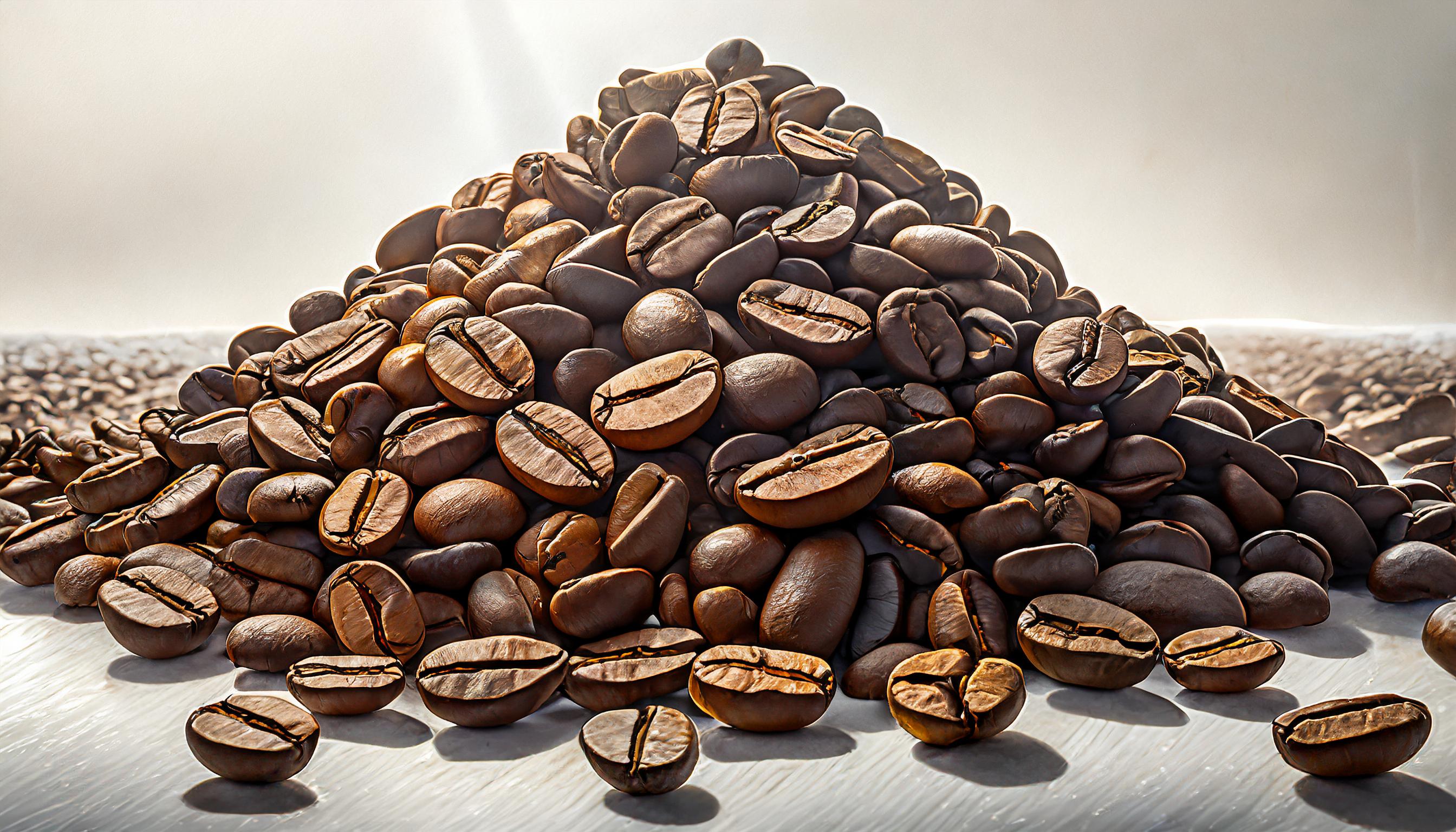 A heap of coffee beans piled on top of each other in the middle of the frame, with a completely white, uniform background without any shading. The focus is on the texture and detail of the coffee beans, highlighting their rich brown colors and the way they interlock and stack. The composition is simple and minimalist, emphasizing the natural beauty of the coffee beans against the stark white backdrop. The lighting is soft, casting gentle shadows and enhancing the contours of each bean for a striking contrast.