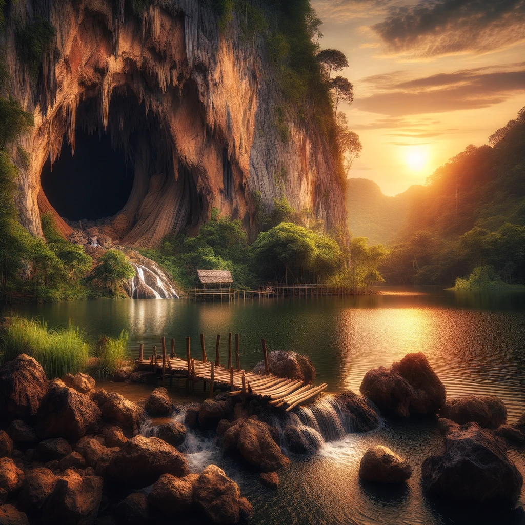 Un paysage naturel présentant un lac. Au premier plan, un tas de roches d'où s'étend un petit pont en bois. À mi-distance, une cascade couvrant presque toute l'entrée d'une grotte. Autour de la grotte, une végétation luxuriante, avec le soleil couchant en arrière-plan. La scène combine la beauté sereine d'un cadre lacustre avec l'élément dramatique de la cascade et de la grotte, rehaussée par la lueur chaude du coucher de soleil.