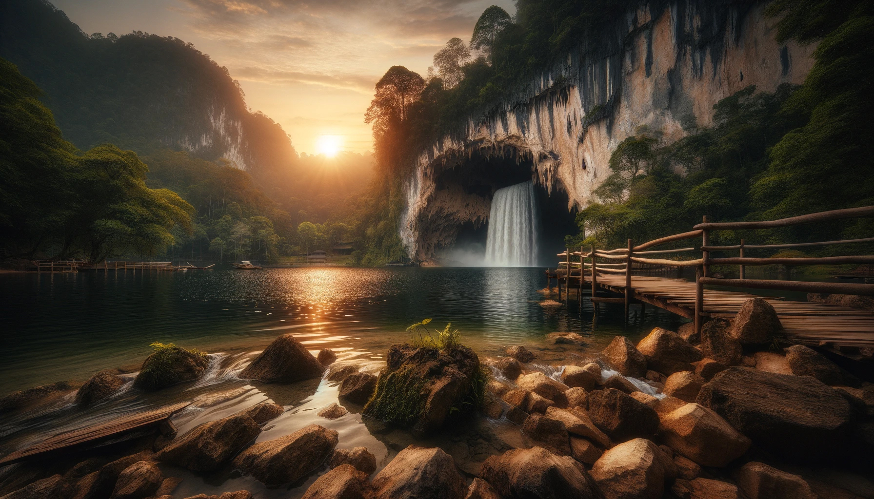 Un paysage naturel présentant un lac. Au premier plan, un tas de roches d'où s'étend un petit pont en bois. À mi-distance, une cascade couvrant presque toute l'entrée d'une grotte. Autour de la grotte, une végétation luxuriante, avec le soleil couchant en arrière-plan. La scène combine la beauté sereine d'un cadre lacustre avec l'élément dramatique de la cascade et de la grotte, rehaussée par la lueur chaude du coucher de soleil.