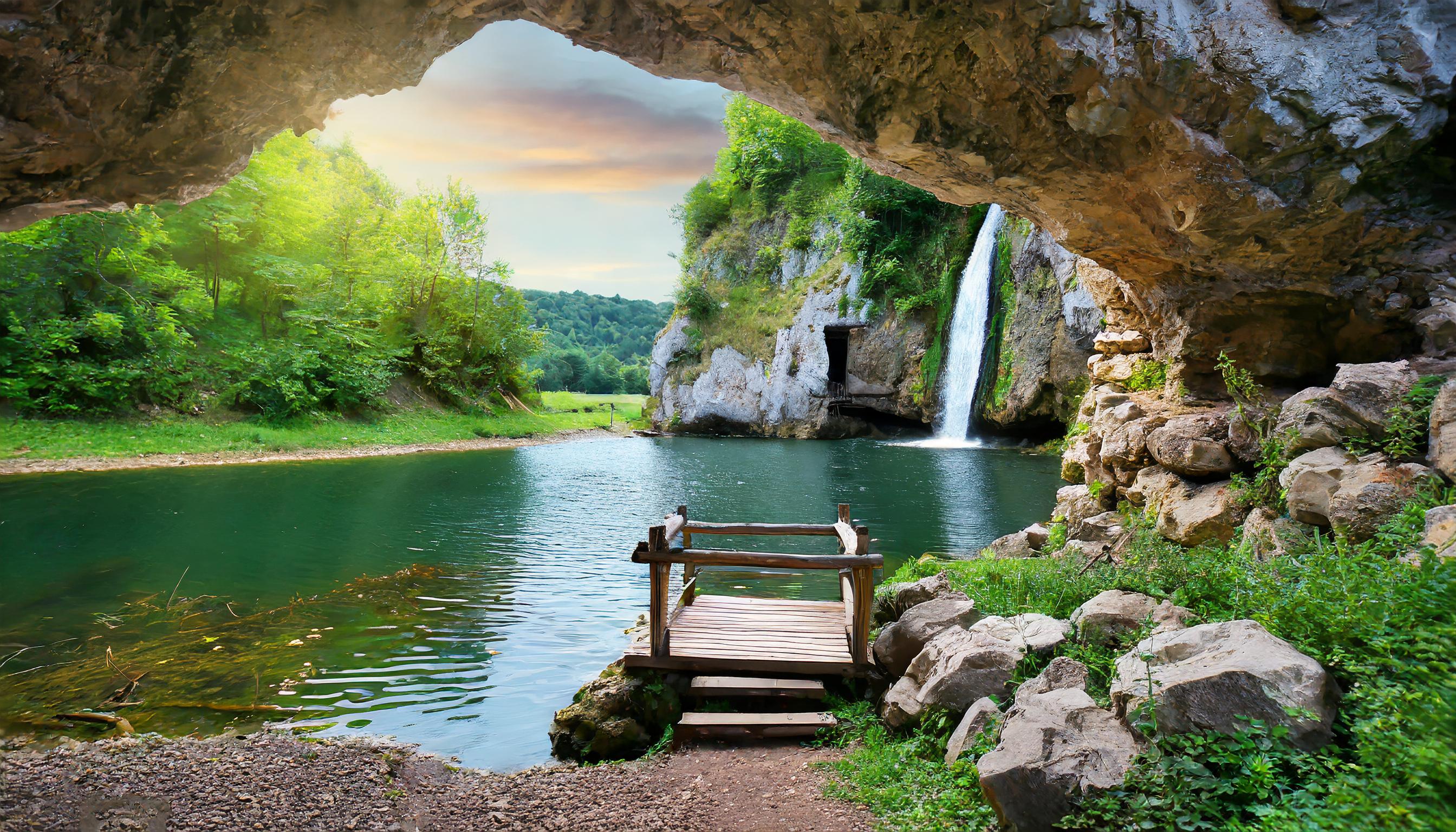 Un paysage naturel présentant un lac. Au premier plan, un tas de roches d'où s'étend un petit pont en bois. À mi-distance, une cascade couvrant presque toute l'entrée d'une grotte. Autour de la grotte, une végétation luxuriante, avec le soleil couchant en arrière-plan. La scène combine la beauté sereine d'un cadre lacustre avec l'élément dramatique de la cascade et de la grotte, rehaussée par la lueur chaude du coucher de soleil.