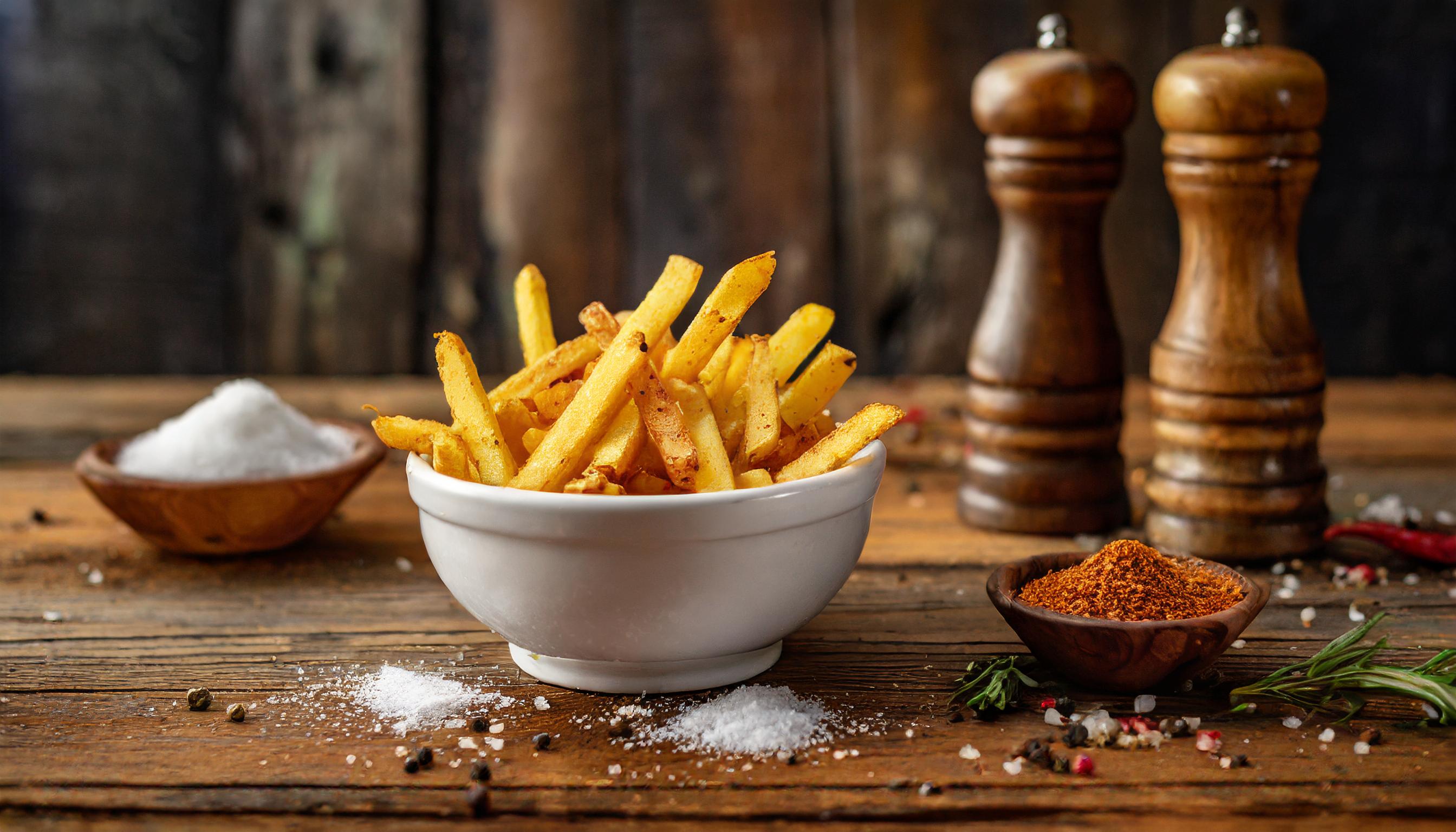 A close-up view showcases an old wooden table with a white bowl filled with fries, carefully placed to not overflow. The only other items visible on the table are grains of coarse salt and a pepper shaker, emphasizing a minimalist setting. There is nothing else on the table, focusing all attention on the bowl of fries, the salt, and the pepper. This composition highlights the simplicity and rustic elegance of the scene, with the wooden table's texture adding depth and character.
