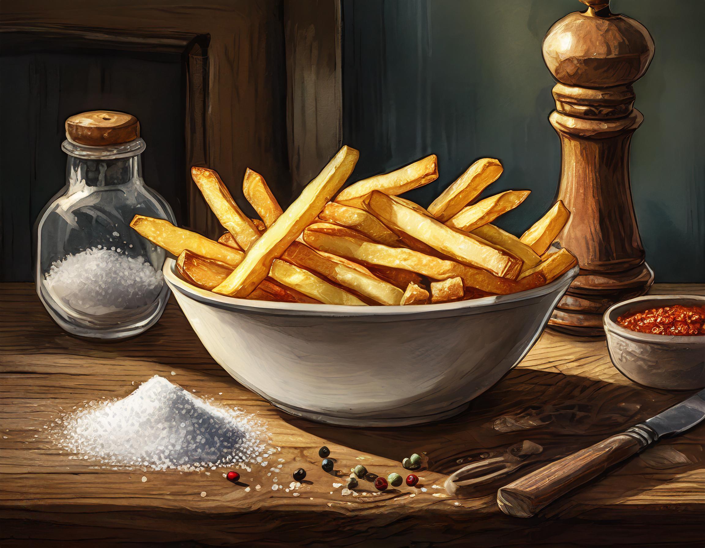 A close-up view showcases an old wooden table with a white bowl filled with fries, carefully placed to not overflow. The only other items visible on the table are grains of coarse salt and a pepper shaker, emphasizing a minimalist setting. There is nothing else on the table, focusing all attention on the bowl of fries, the salt, and the pepper. This composition highlights the simplicity and rustic elegance of the scene, with the wooden table's texture adding depth and character.