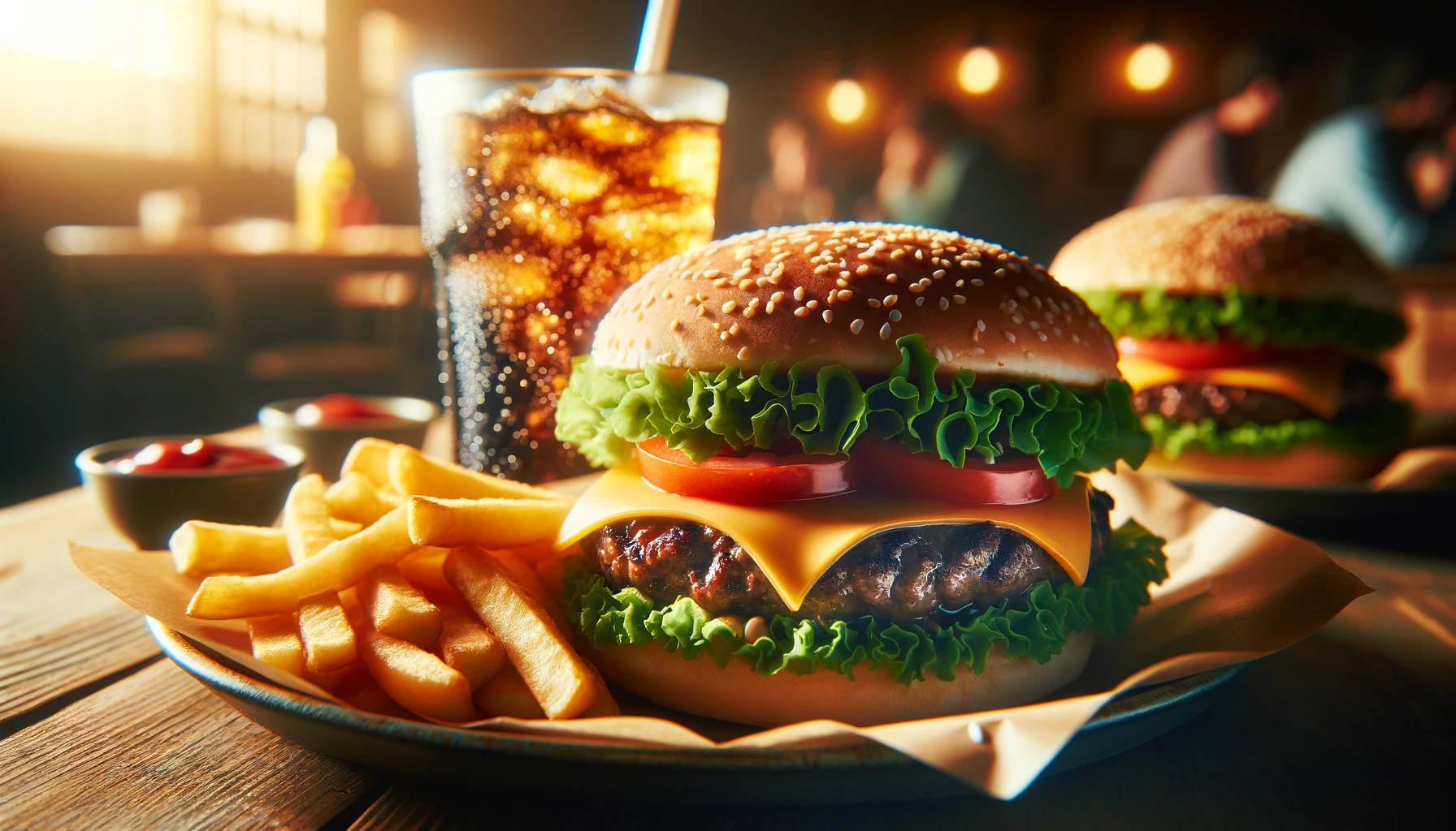 Sur une table de restaurant en gros plan, un grand hamburger avec des frites et une boisson est servi au premier plan, avec une vue de face.
