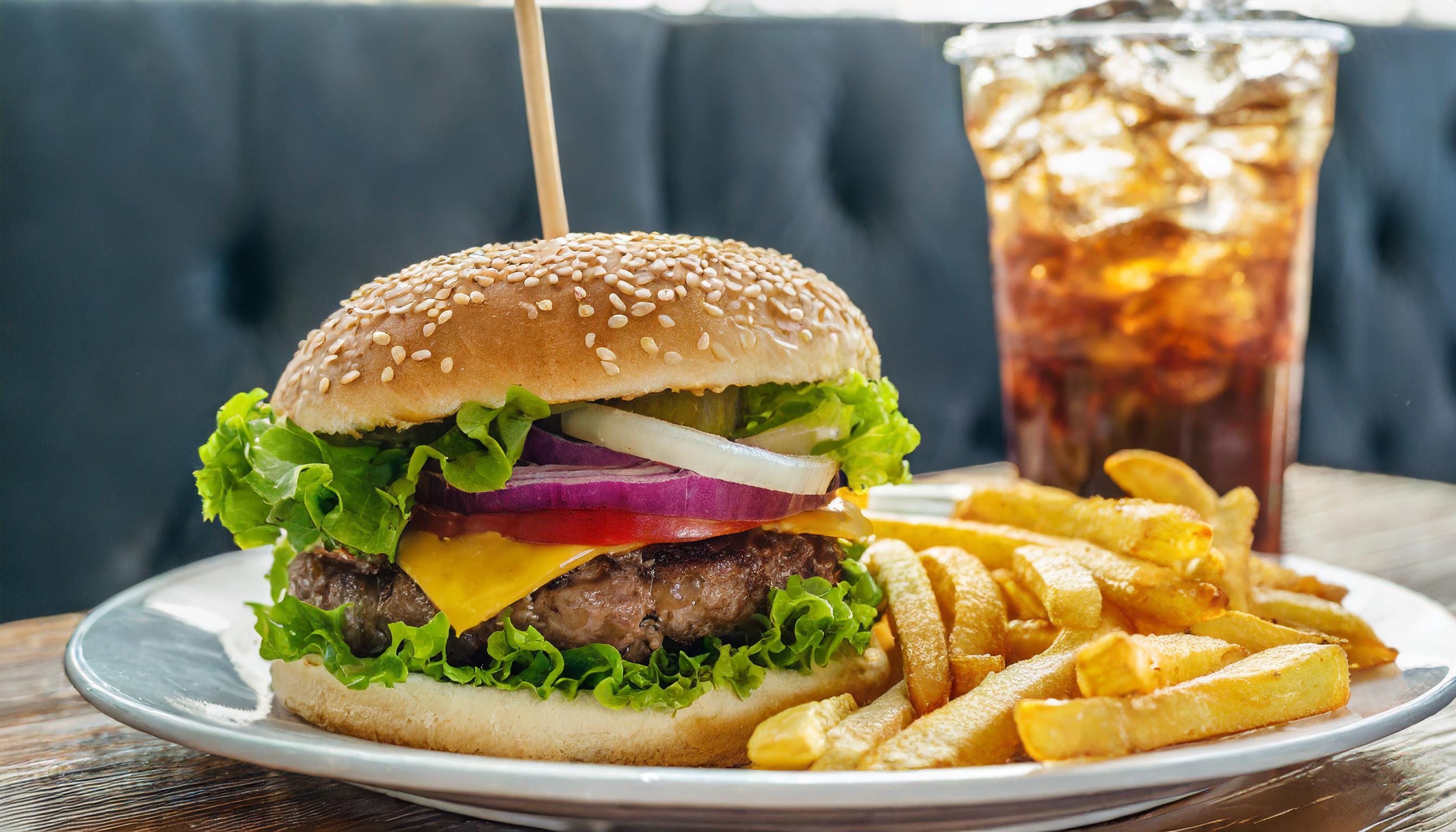 Sur une table de restaurant en gros plan, un grand hamburger avec des frites et une boisson est servi au premier plan, avec une vue de face.