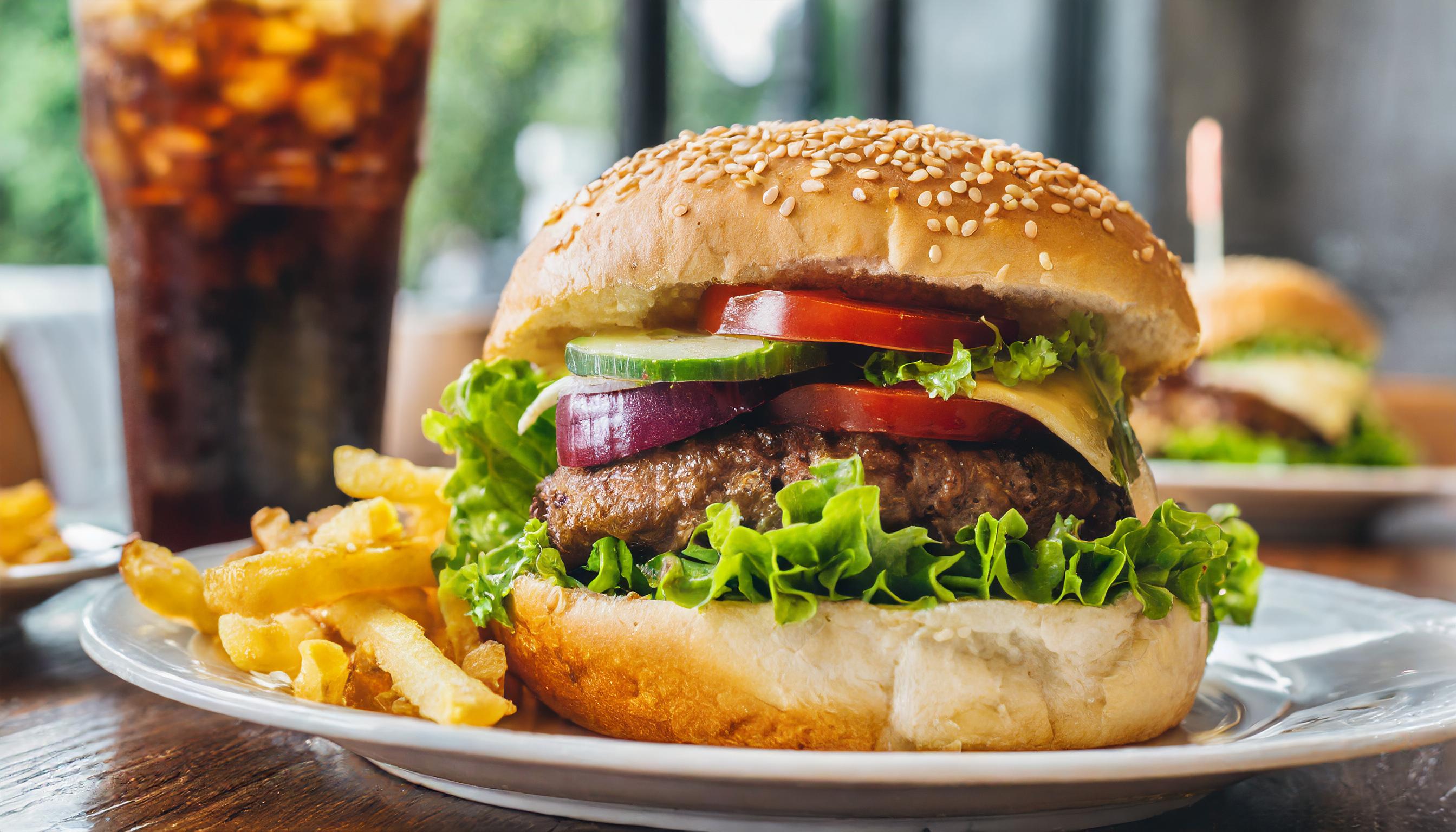 On a restaurant table in close-up, a large hamburger with fries and a drink is served in the foreground, with a front view.