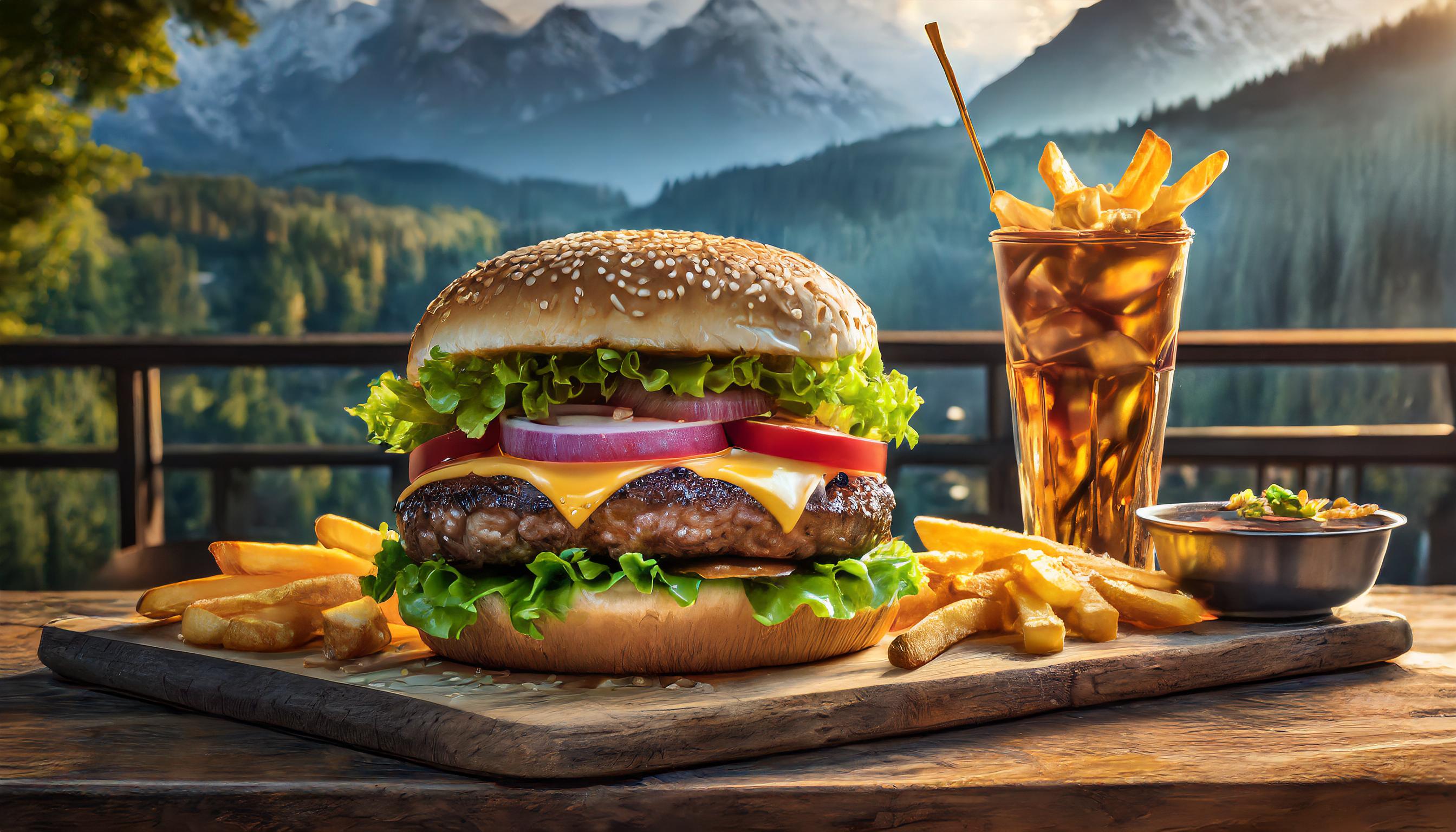 Sur une table de restaurant en gros plan, un grand hamburger avec des frites et une boisson est servi au premier plan, avec une vue de face.