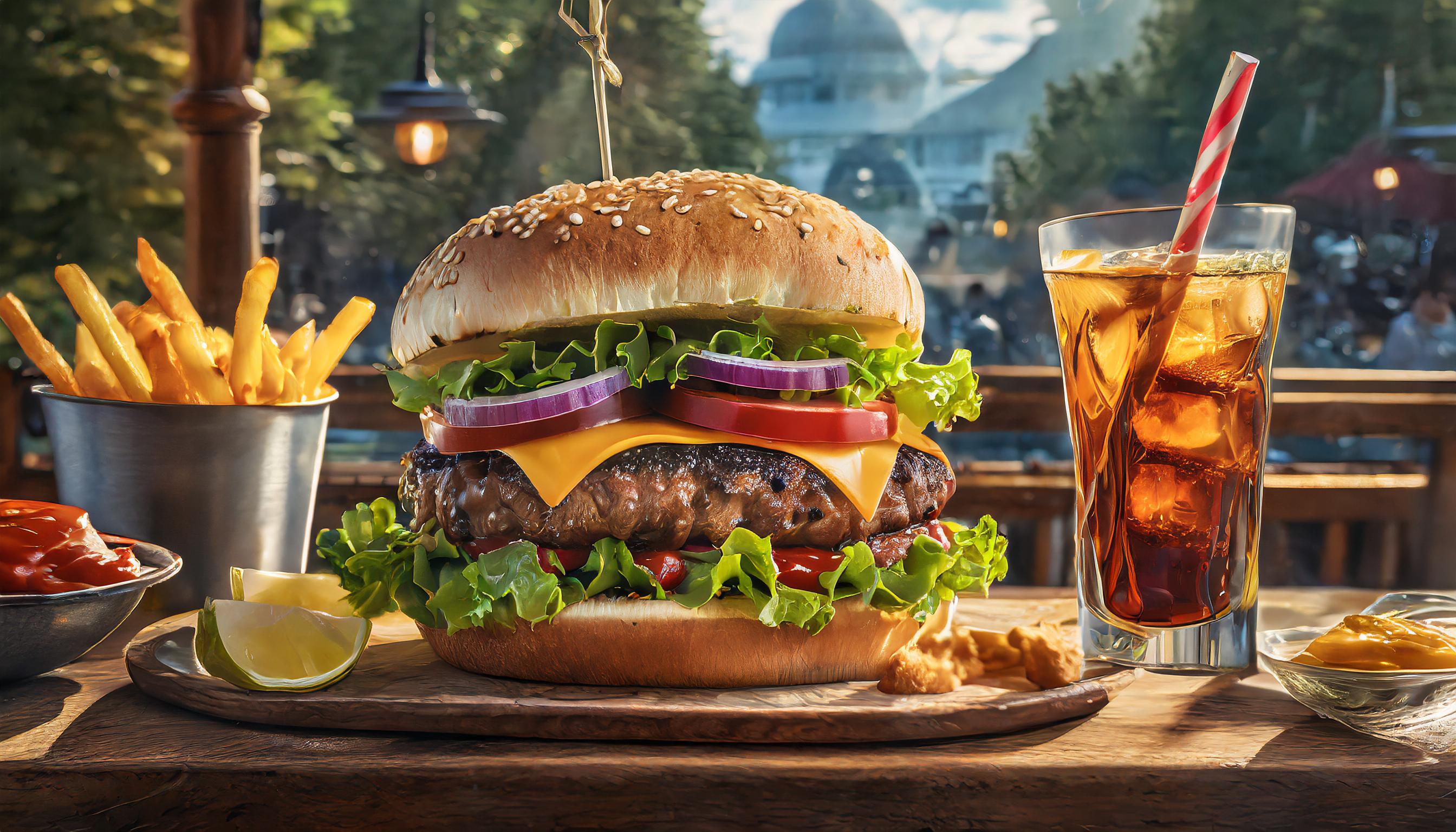 Sur une table de restaurant en gros plan, un grand hamburger avec des frites et une boisson est servi au premier plan, avec une vue de face.