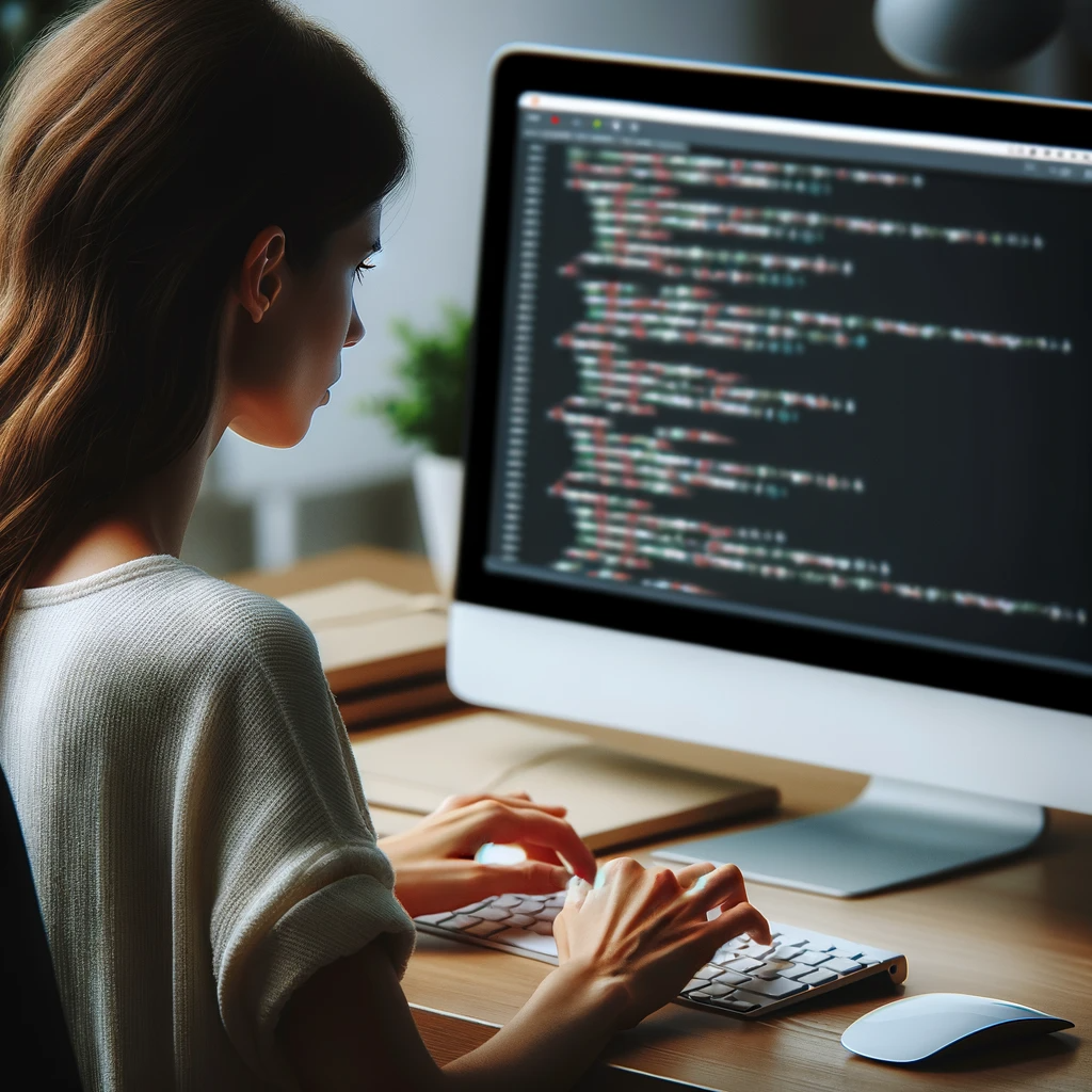 A woman seen from a 3/4 angle from behind, sitting at a desk and typing on a keyboard. On her desk is a screen displaying lines of code. The focus is on her typing and the screen with the code, capturing the essence of a work environment in the tech industry.