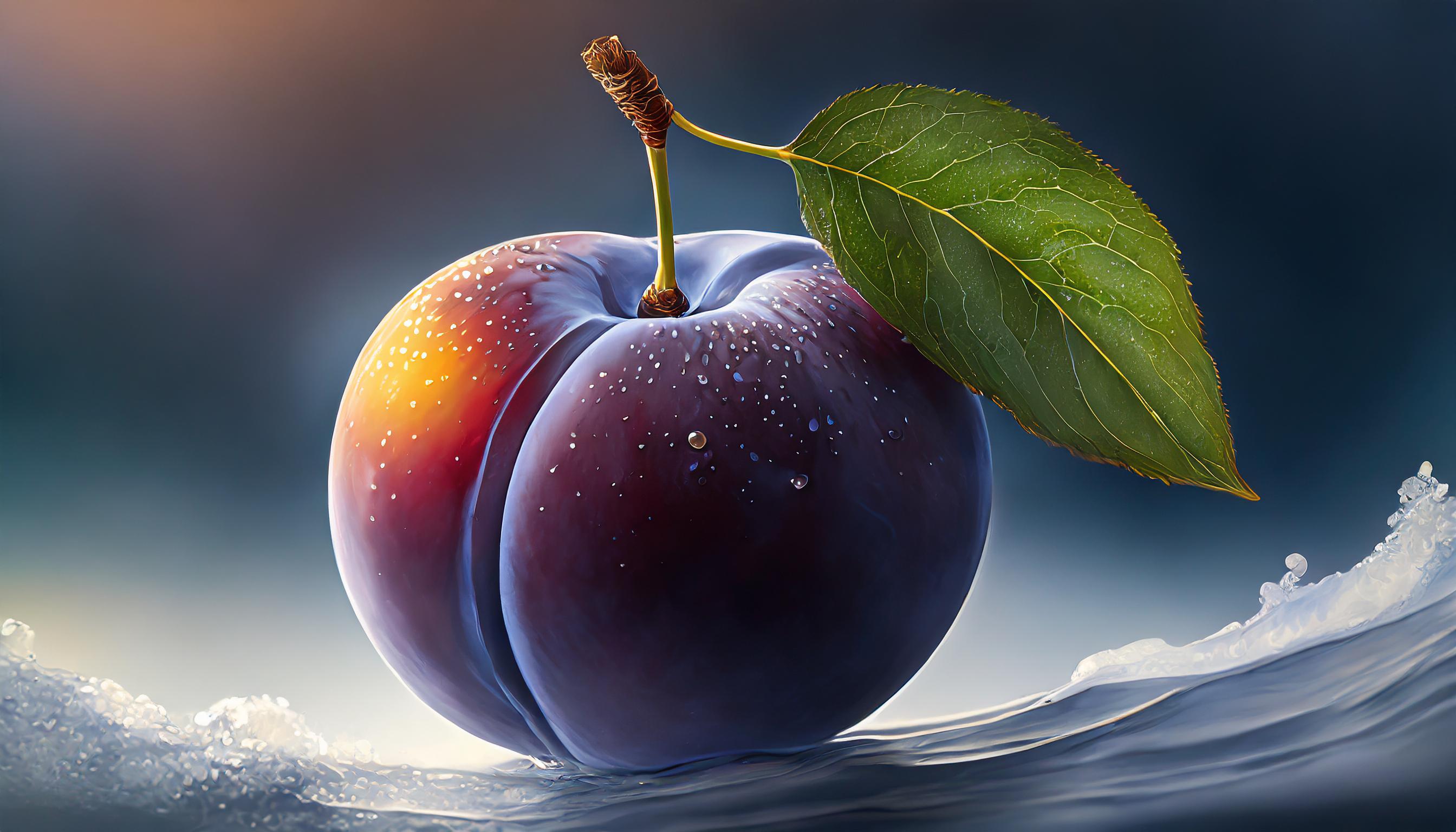 A highly detailed and realistic image of a single, whole plum isolated on a plain white background. The fruit occupies the entire frame without exceeding the boundaries. It is not cut in half, and there is only one plum. The image is very precise, highlighting the texture of the plum's skin. The plum is illuminated by soft light, enhancing its shape while maintaining the focus on its texture. The plum is without any leaves.