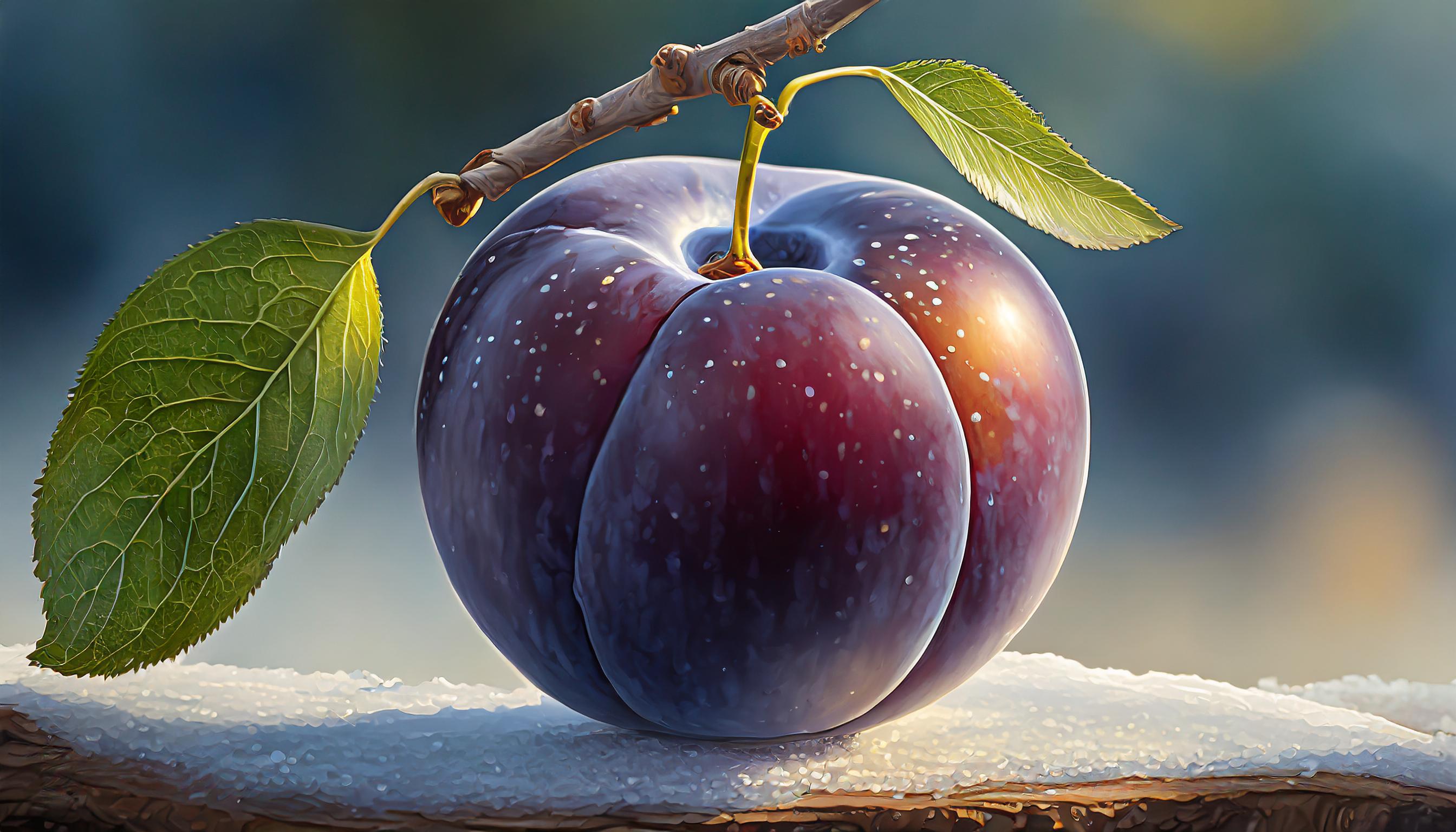 A highly detailed and realistic image of a single, whole plum isolated on a plain white background. The fruit occupies the entire frame without exceeding the boundaries. It is not cut in half, and there is only one plum. The image is very precise, highlighting the texture of the plum's skin. The plum is illuminated by soft light, enhancing its shape while maintaining the focus on its texture. The plum is without any leaves.