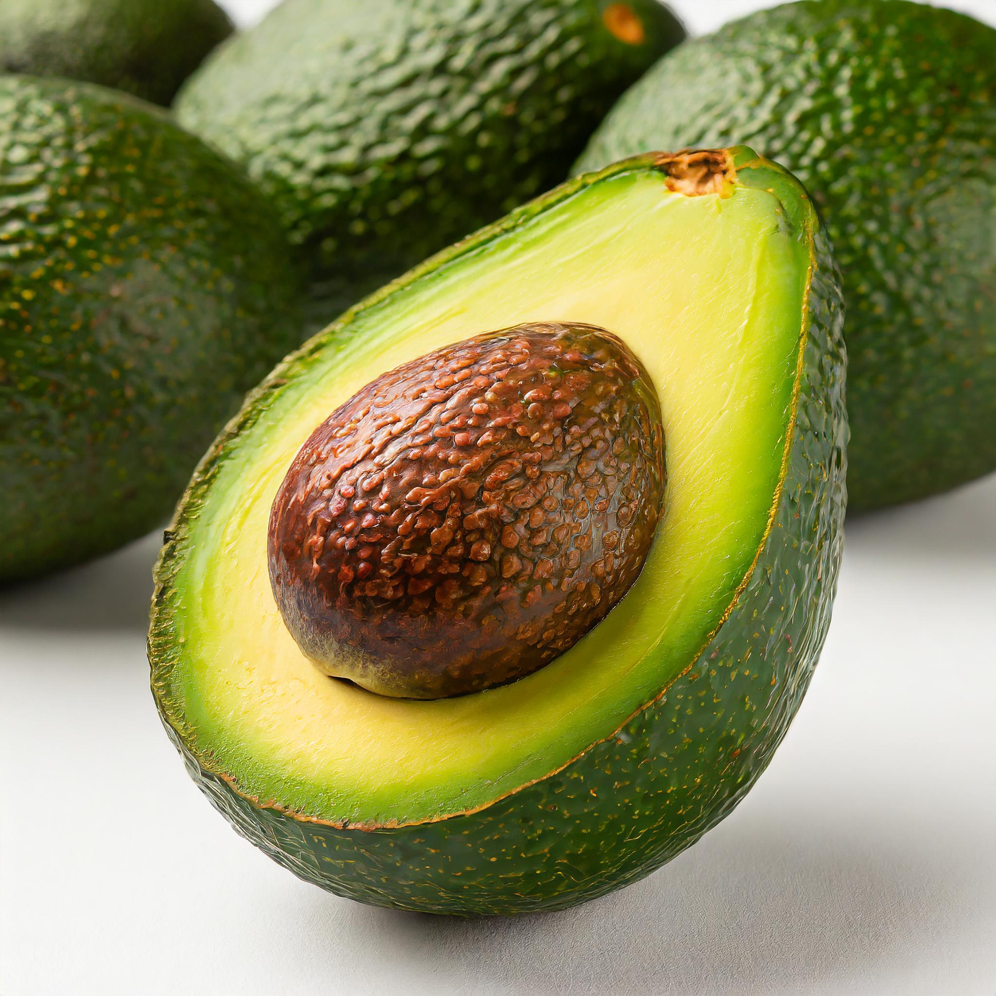Une image très détaillée et réaliste d'un Avocat isolé sur un fond blanc uni. Le fruit remplit tout le cadre sans dépasser les bordures, entier et solitaire. La précision de l'image expose vivement la texture de la peau. L'Avocat est illuminé par une lumière douce, soulignant sa forme mais dépourvu de feuilles. L'accent est mis sur la capture de la texture de surface de l'Avocat et de sa forme générale avec un haut niveau de détail.