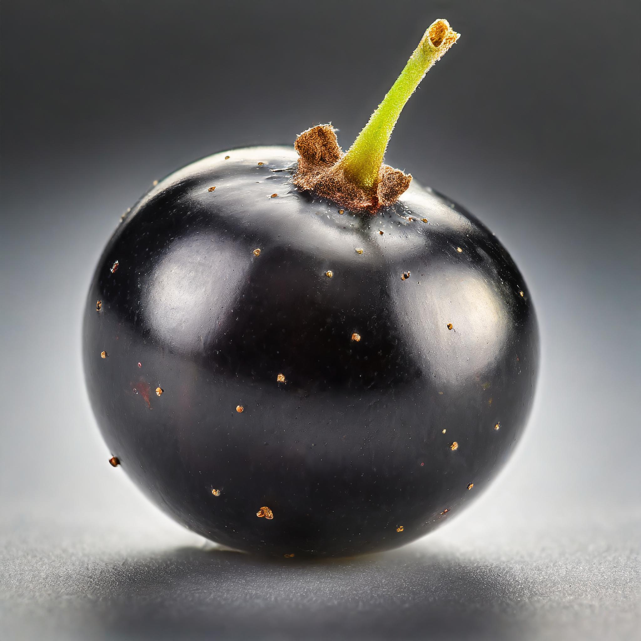 A very detailed and realistic image of a single blackcurrant isolated on a plain white background. The fruit occupies the entire frame without overflowing or exceeding the boundaries. An intact, whole blackcurrant, not cut in half, and there's only one blackcurrant in the image. The image is very precise, allowing for appreciation of the skin texture. The blackcurrant is illuminated by soft light, still highlighting its shape. The blackcurrant is without leaves.
