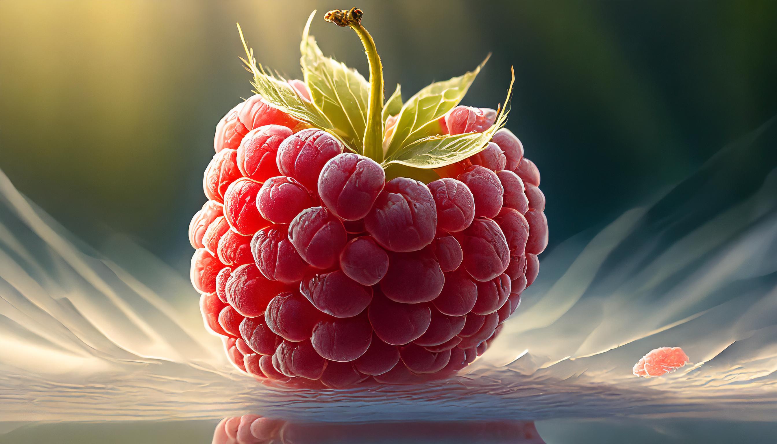 Une image très détaillée et réaliste d'une seule framboise isolée sur un fond blanc uni. Le fruit remplit le cadre sans dépasser ses limites ni déborder. La framboise est entière, non coupée en deux, et il n'y a qu'une seule framboise. L'image est très précise, mettant en avant la texture de la peau. La framboise est éclairée par une lumière douce, soulignant sa forme. La framboise est sans feuilles.